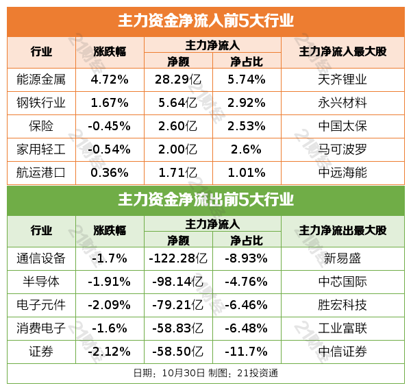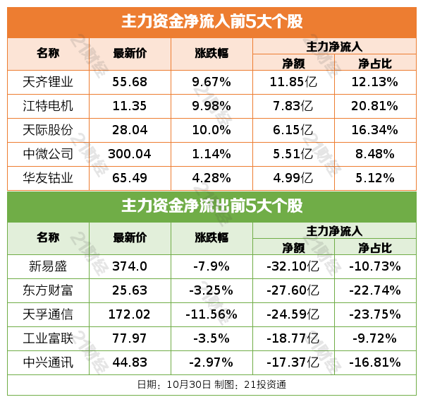 10月30日,市场震荡调整,三大指数盘中均出现跳水,创业板指跌近2%,沪指失守4000点。截至收盘,沪指跌0.73%,深成指跌1.16%,创业板指跌1.84%。沪深两市成交额2.42万亿,较上一个交易日放量1656亿。