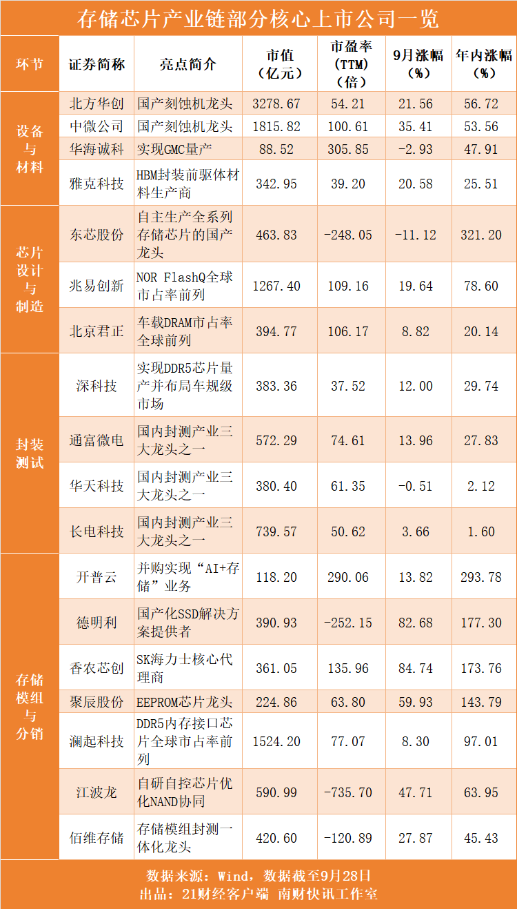 21财经·南财快讯记者此前梳理发现,目前已有多家A股上市公司在存储芯片方面有所布局,涉及设备与材料、芯片设计与制造等多个环节。其中,国产存储芯片生产龙头东芯股份,年内涨幅高达329.32%;SK海力士的核心代理商香农芯创,9月涨幅超过116.56%;国产化SSD解决方案提供者德明利,9月获6个涨停板。