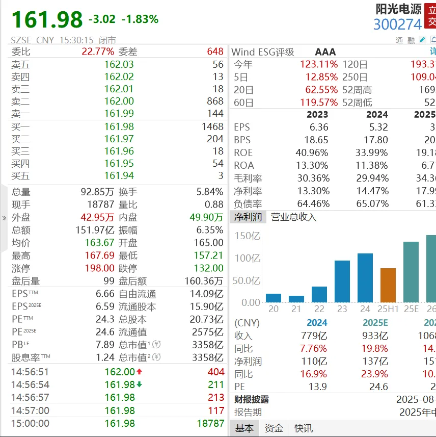 近日,阳光电源在二级市场走势相当抢眼,公司股价持续攀高,9月份累计涨幅超62%,总市值突破3300亿元,稳居A股光储板块“市值一哥”的席位。