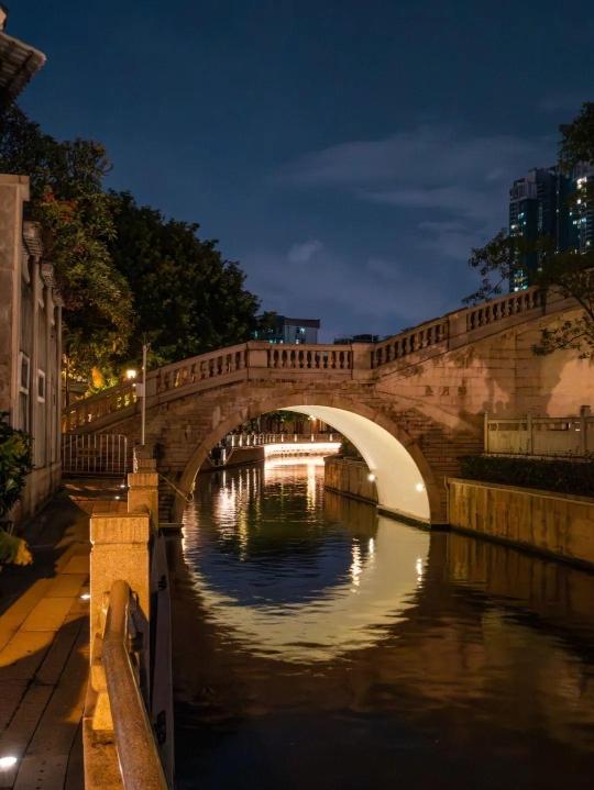 西关永庆坊是体验广府文化的好去处,中秋期间尤为浪漫。“月亮桥”是热门打卡点,桥洞与倒影形成完美圆月,水中月与天上月相映成趣。