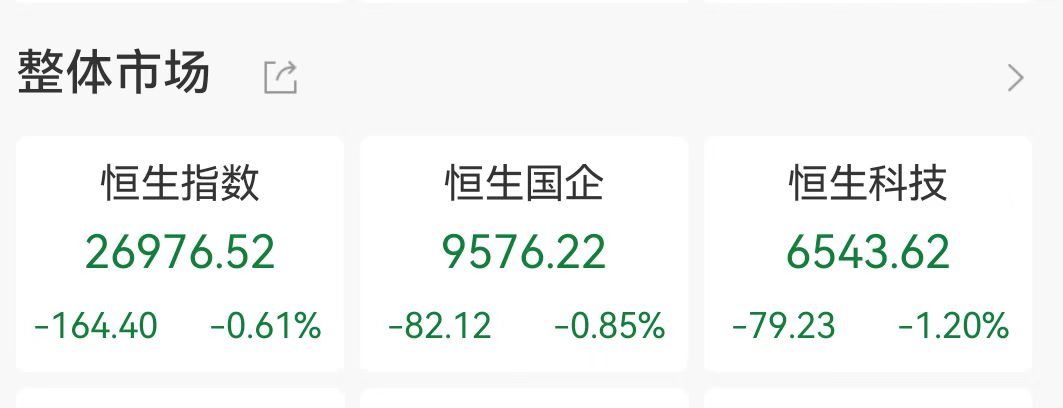10月6日,港股三大指数调整,截至午盘收盘,香港恒生指数微跌0.61%,报26976.52点;恒生科技指数下挫1.20%,报6543.62点;恒生中国企业指数走低0.85%,报9576.22点。市场半日成交额为723.38亿港元。