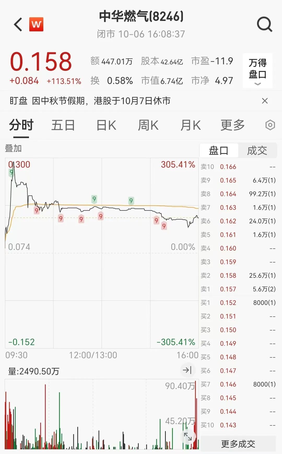 此外,中华燃气(08246.HK)早盘一度大涨超300%,截至收盘,该股仍涨113.51%,报0.158港元/股。该公司此前公告称,公司10月3日(交易时段后)与认购人订立认购协议,认购人有条件同意认购而公司有条件同意配发及发行合共3.34亿股认购股份,认购价为每股0.075港元。据悉,这一认购价较10月3日收盘价每股0.074港元溢价约1.35%。