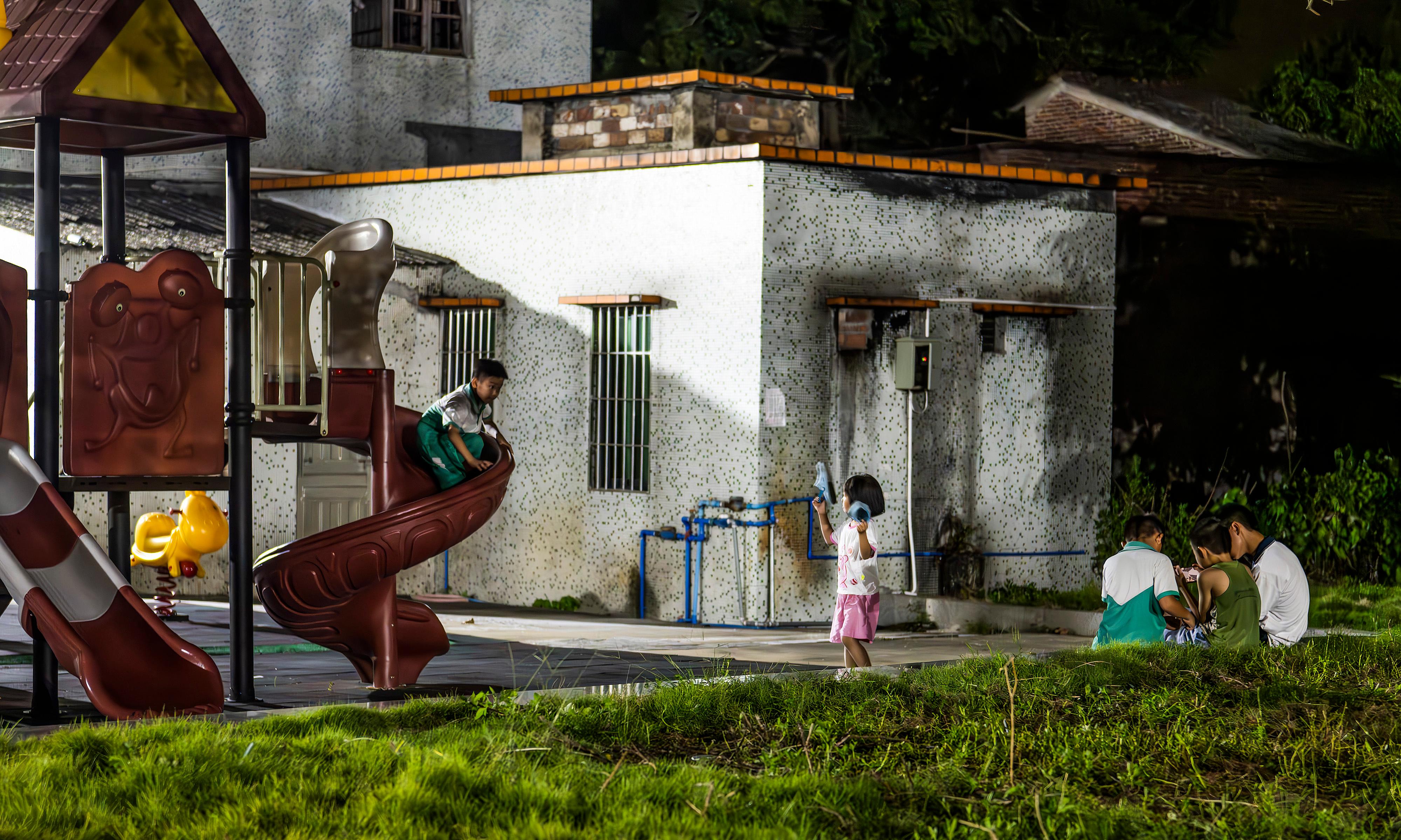 9月12日,孩子们在塱头村新村的公共游乐设施玩耍。