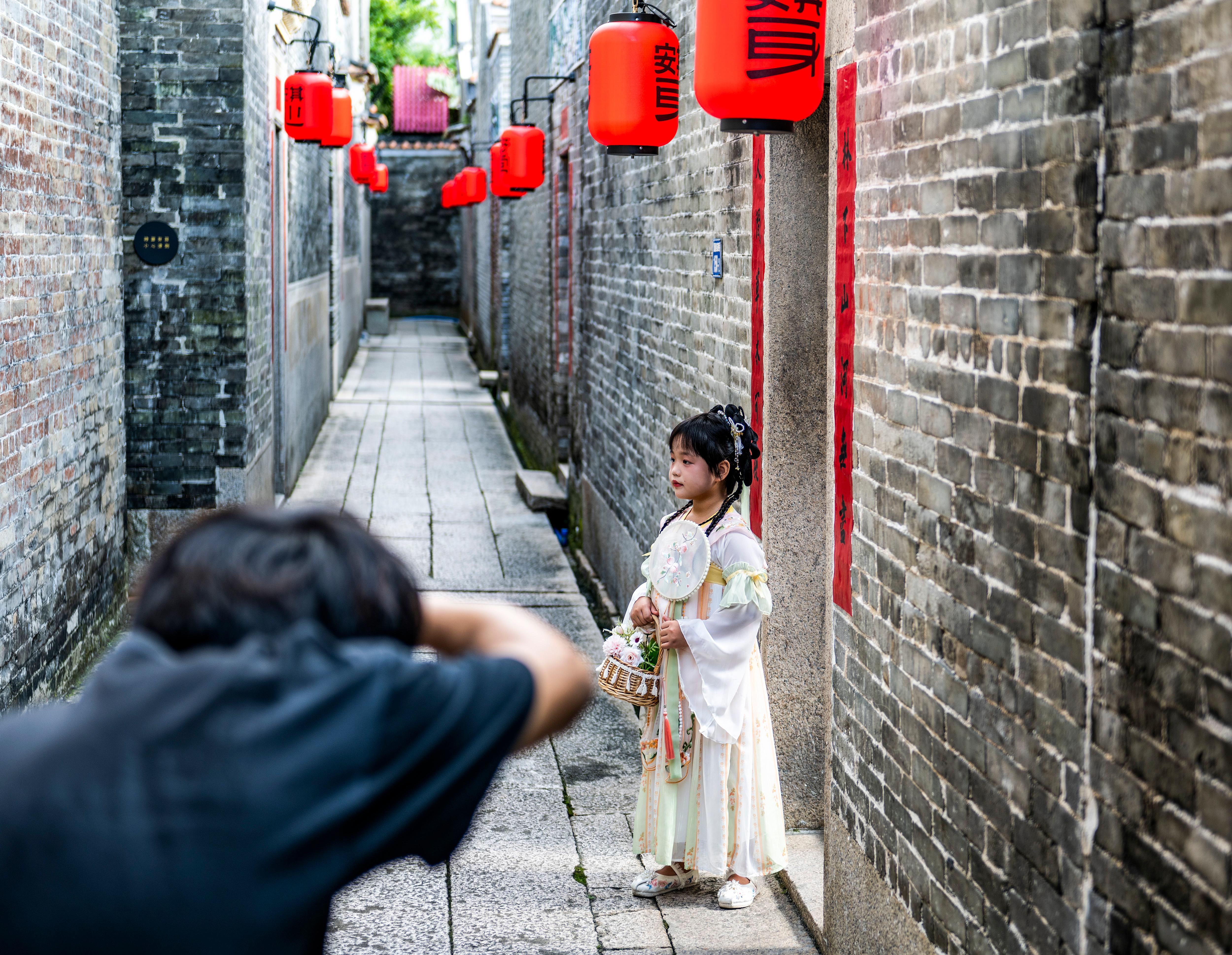 9月13日,摄影师在塱头村积墨楼为孩子拍摄古风写真。