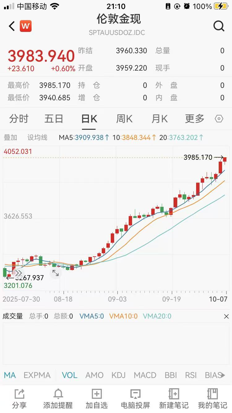 现货黄金日内涨0.5%,触及3980美元/盎司,创历史新高。