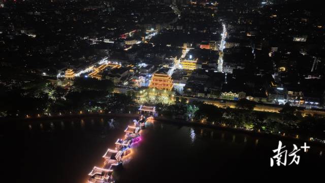 傍晚时分,华灯初上,潮州古城内的游客惊喜地发现,一场以韩江为画布、以广济桥为舞台的文旅大秀拉开帷幕。随着潮州大锣鼓韵律响起,16名鲤鱼舞演员在桥上翩然起舞,数艘灯船从江心缓缓驶过,船上民乐悠扬,“府楼猴”形象的人偶和汉服演员在船上挥手致意。