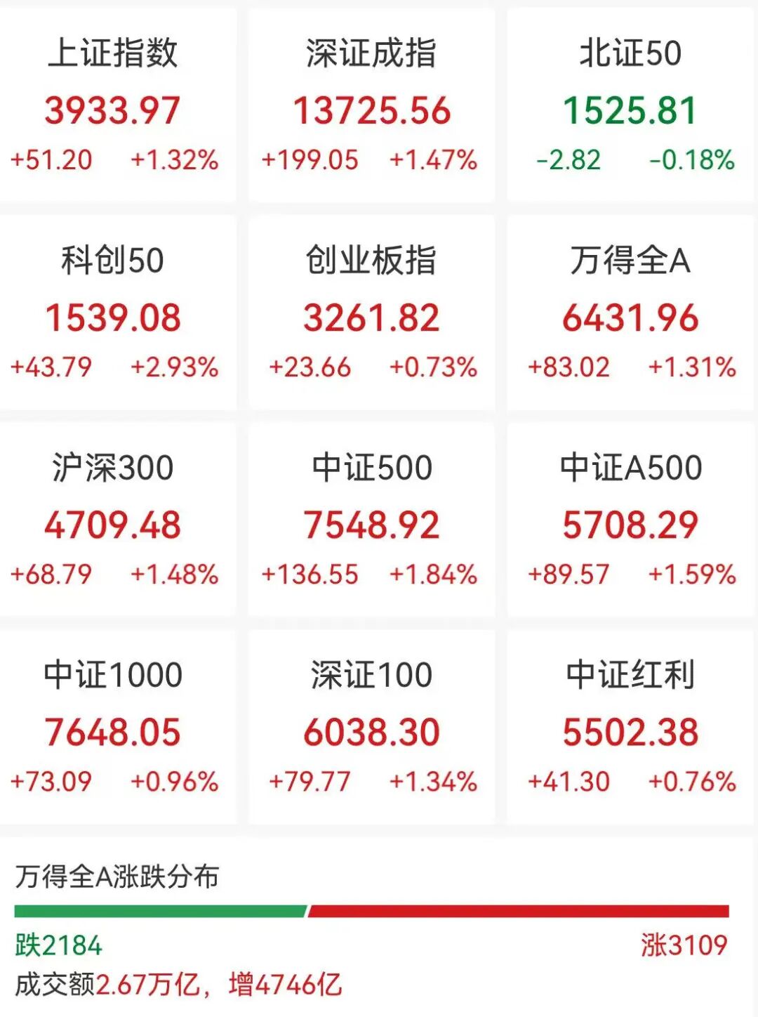 10月9日午后,A股三大指数保持涨势。截至收盘,沪指涨1.32%站稳3900点,深成指涨1.47%,创业板指涨0.73%。市场总成交额2.67万亿,全市场超3100股上涨,共有99只个股涨停。