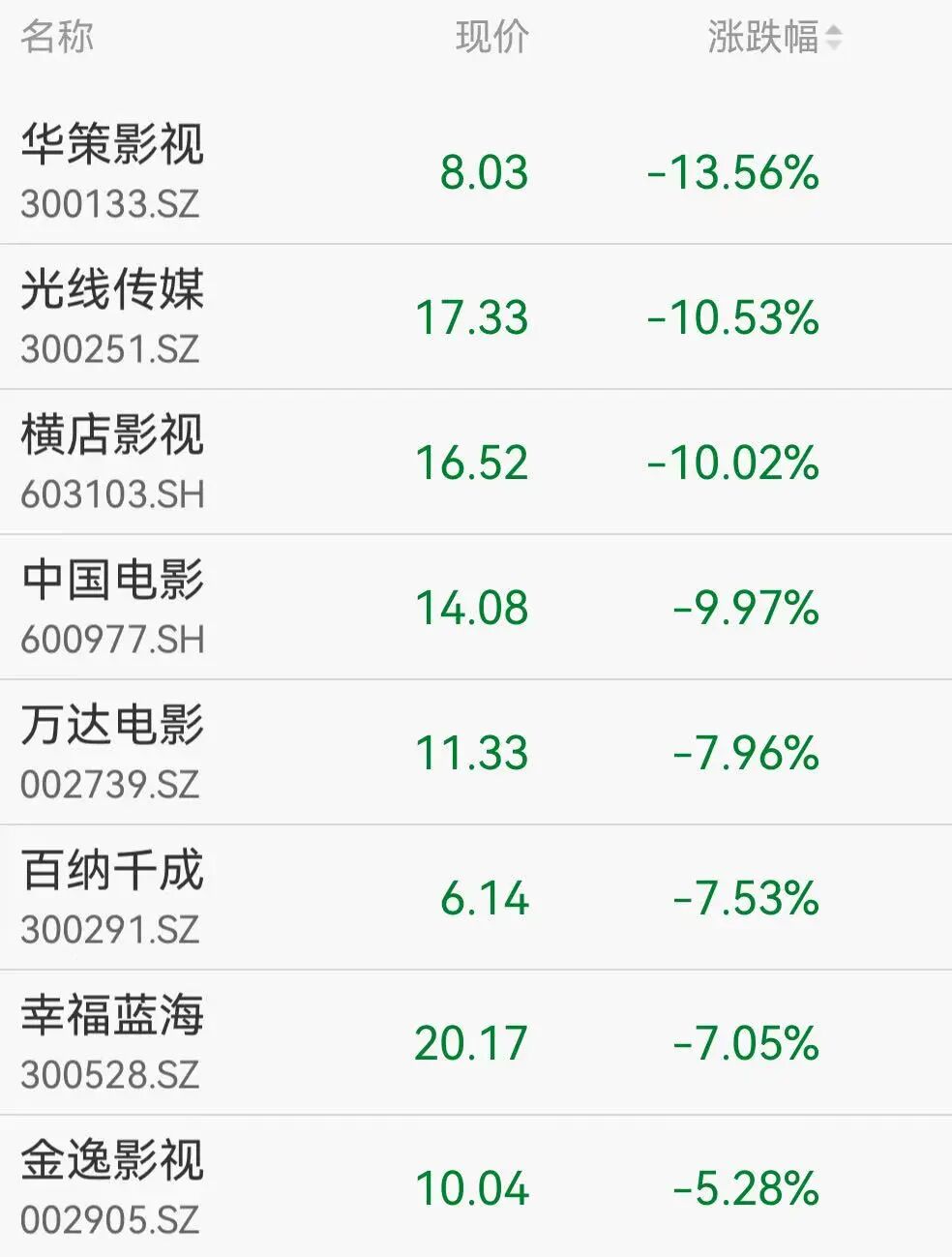 10月9日,影视院线板块遭遇重挫,多家影视公司股价大跌,截至收盘,横店影视、中国电影跌停,华策影视跌超13%、光线传媒、万达电影等跌幅居前。