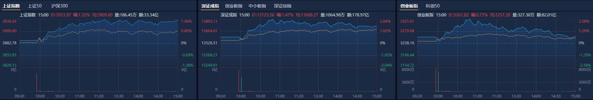 10月首个交易日,沪指高开高走突破3900点整数大关,刷新2015年8月以来新高。截至收盘,沪指涨1.32%,深成指涨1.46%,创业板指涨0.73%。沪深两市成交额2.65万亿元,较上一个交易日放量4718亿元。板块方面,有色金属、核电、稀土永磁等板块涨幅居前,影视院线、旅游、教育等板块跌幅居前。