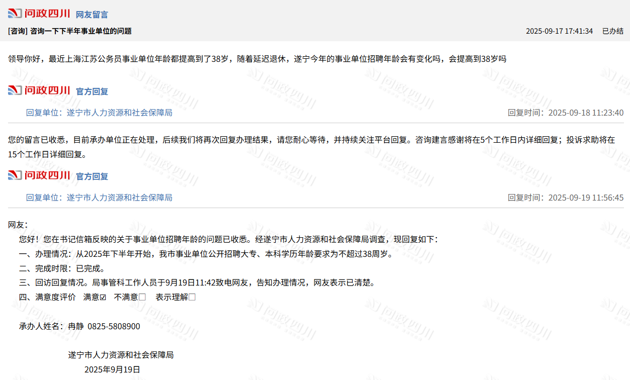 遂宁市人力资源和社会保障局在问政四川上给网友回复也明确,从2025年下半年开始,事业单位公开招聘大专、本科学历年龄要求为不超过38周岁。