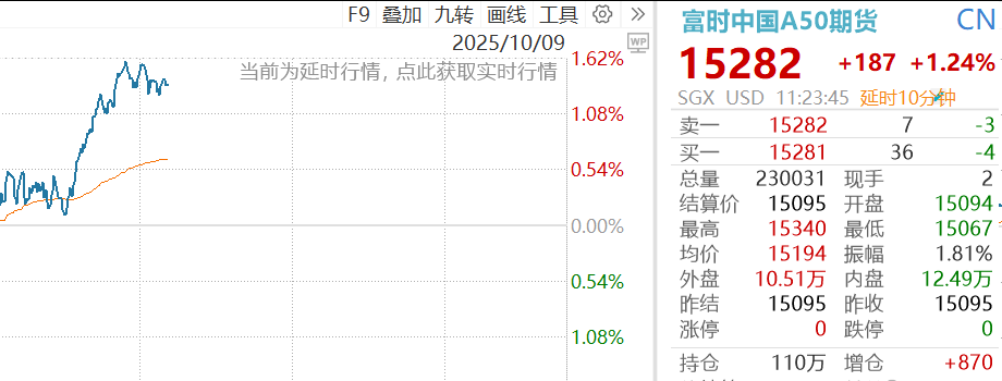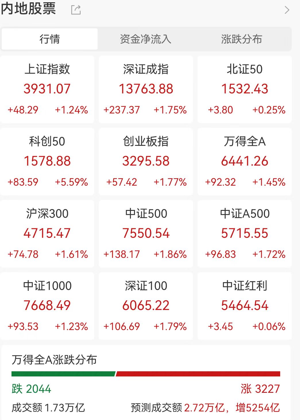 10月9日,三大指数集体高开,涨幅持续扩大。截至午间收盘,上证指数涨1.24%报3931.07点,深证成指涨1.75%,创业板指涨1.77%,北证50涨0.25%,科创50涨5.59%,万得全A涨1.45%,万得A500涨1.63%,中证A500涨1.72%,A股半日成交1.73万亿元,全市场超3200只个股上涨。