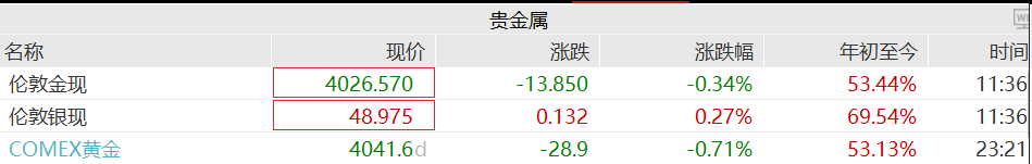 截至11:30,COMEX黄金期货跌0.71%,报4041.6美元/盎司,国庆假期累计上涨4.45%。