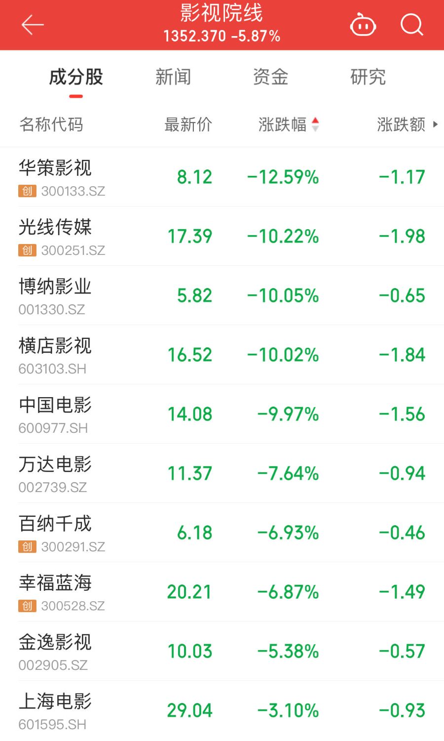 10月9日,影视院线板块开盘遭遇重挫,同花顺iFinD显示,截至午盘,影视院线(801766.SL)跌幅扩大至5.87%。多家影视公司股价同步大跌,华策影视(300133.SZ)大跌12.59%、光线传媒(300251.SZ)跌超10%,博纳影业(001330.SZ)、横店影视(603103.SH)、中国电影(600977.SH)跌停,万达电影(002739.SZ)、幸福蓝海(300528.SZ)等跟跌。