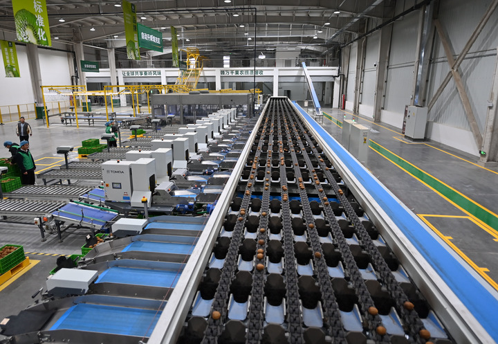 这是10月29日在西安市周至县猕猴桃产业融合发展示范园拍摄的猕猴桃分拣线。