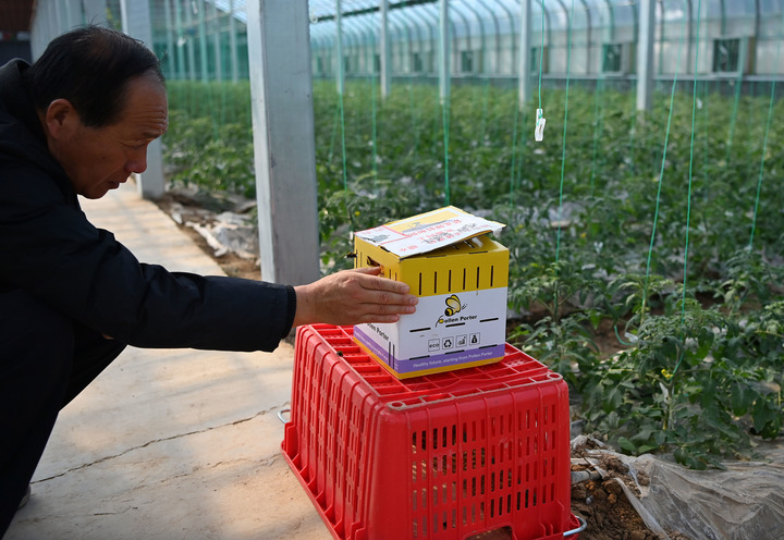 10月27日,在高陵全季西红柿现代农业示范园(城建园)的多功能全季大棚,技术员在查看熊蜂的工作状态。园区推行绿色育苗和种植标准,坚持采用熊蜂授粉,避免人工授粉时激素的使用,确保产品符合绿色要求。