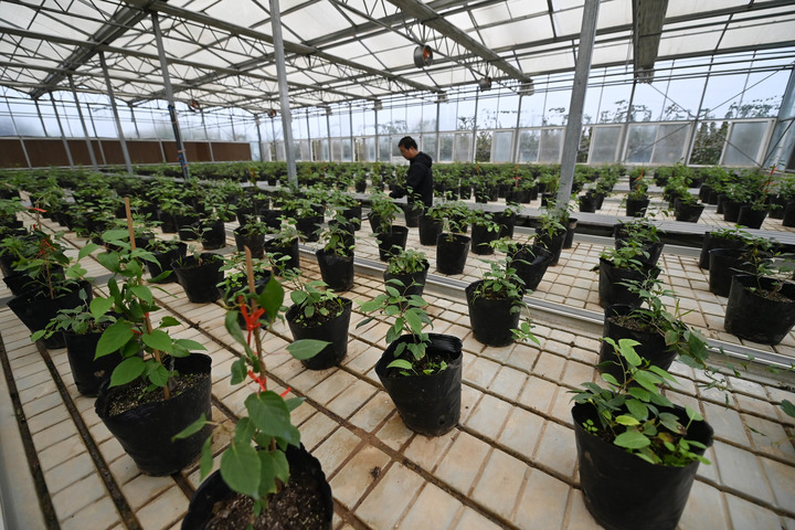 10月29日,在西安市周至县农业科学技术试验站的育苗温室,工作人员在查看猕猴桃砧木试验。砧木是指嫁接繁殖时承受接穗的植株。