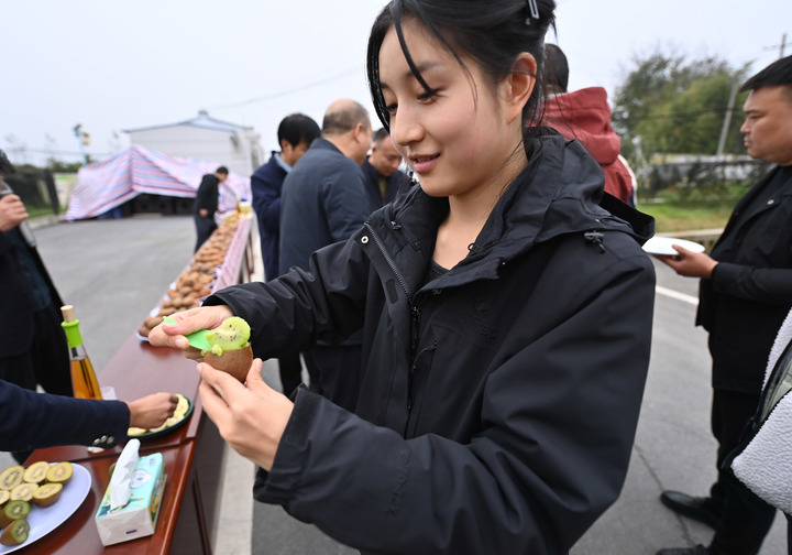 10月29日,在西安市周至县农业科学技术试验站,农业局的工作人员在示范如何用勺子吃猕猴桃。