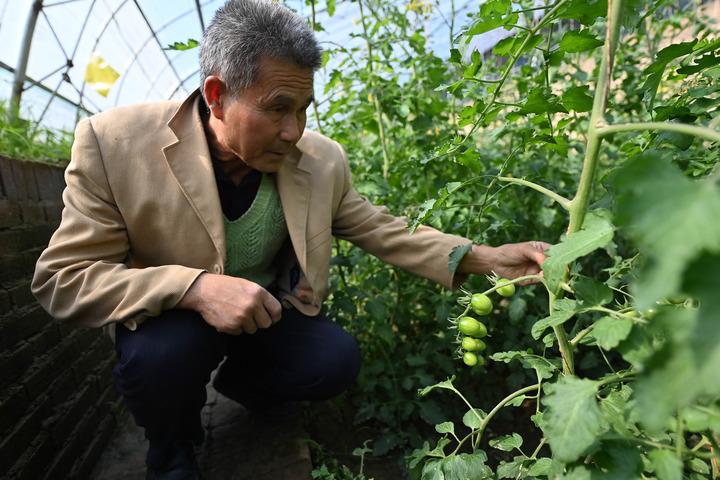 10月27日,农户在高陵区中王农产品专业合作社大棚查看西红柿生长情况。