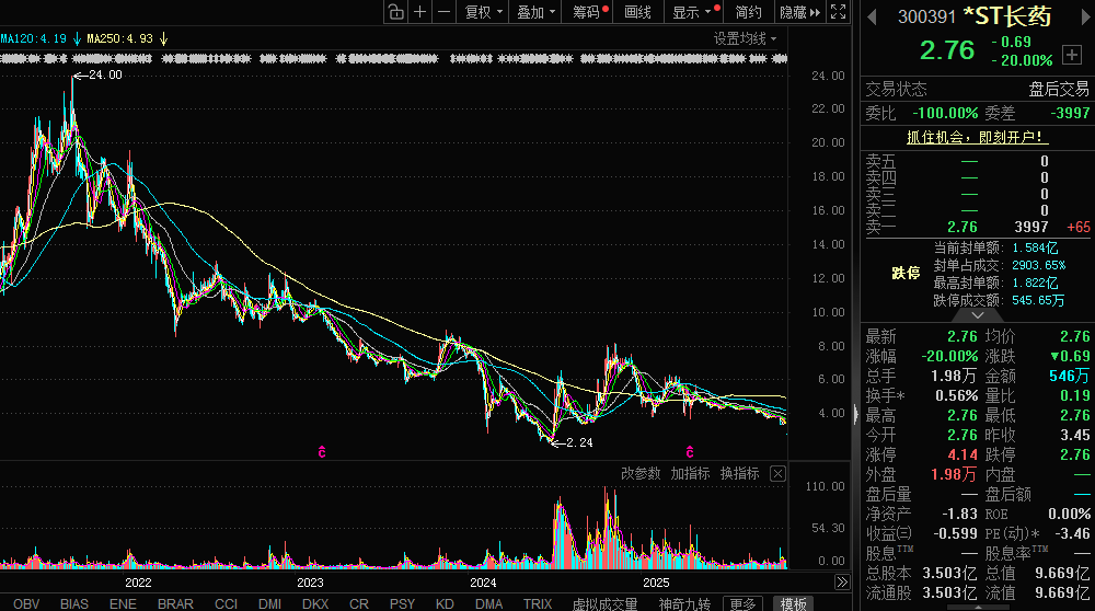 20cm跌停!遭立案调查的*ST长药面临退市风险三重门