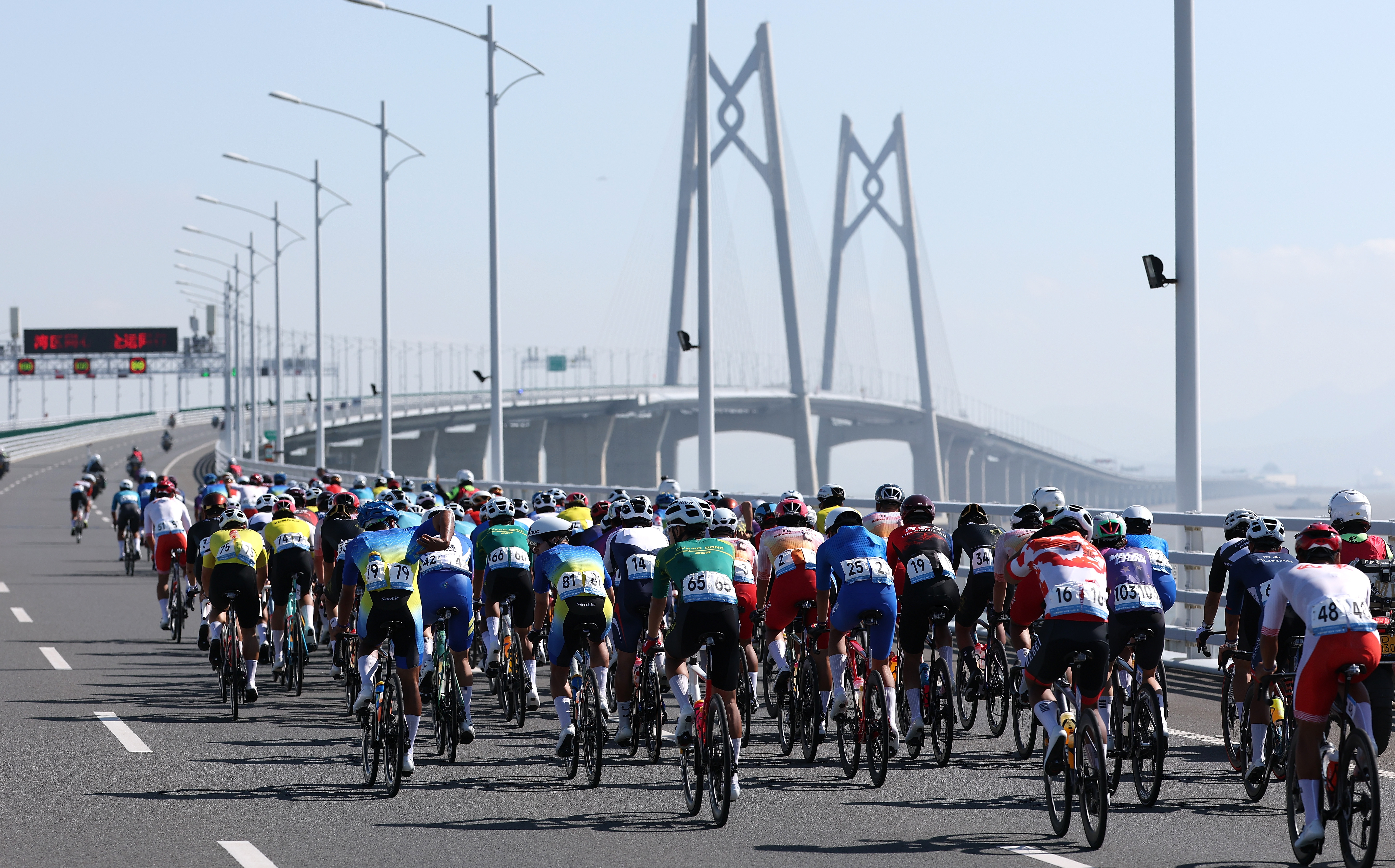 11月8日,参赛选手在港珠澳大桥骑行。当日进行的第十五届全国运动会公路自行车男子个人赛,赛道全程231.8公里,选手经过港珠澳大桥,跨越粤港澳三地。这是全运会历史上首次举办跨境比赛。新华社记者 毛思倩 摄