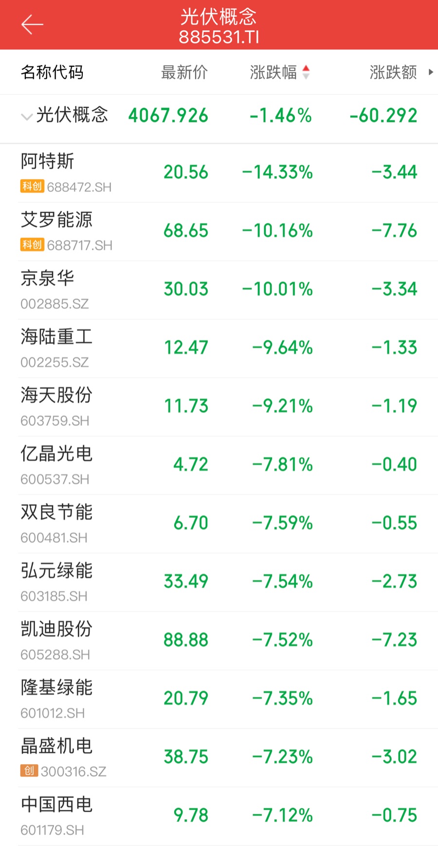 11月12日,A股光伏板块遭遇大面积回调。截至收盘,阿特斯(688472.SH)跌超14%,晶澳科技(002459.SZ)、隆基绿能(601012.SH)、亿晶光电(600537.SH)、双良节能(600481.SH)等个股均跌超6%。