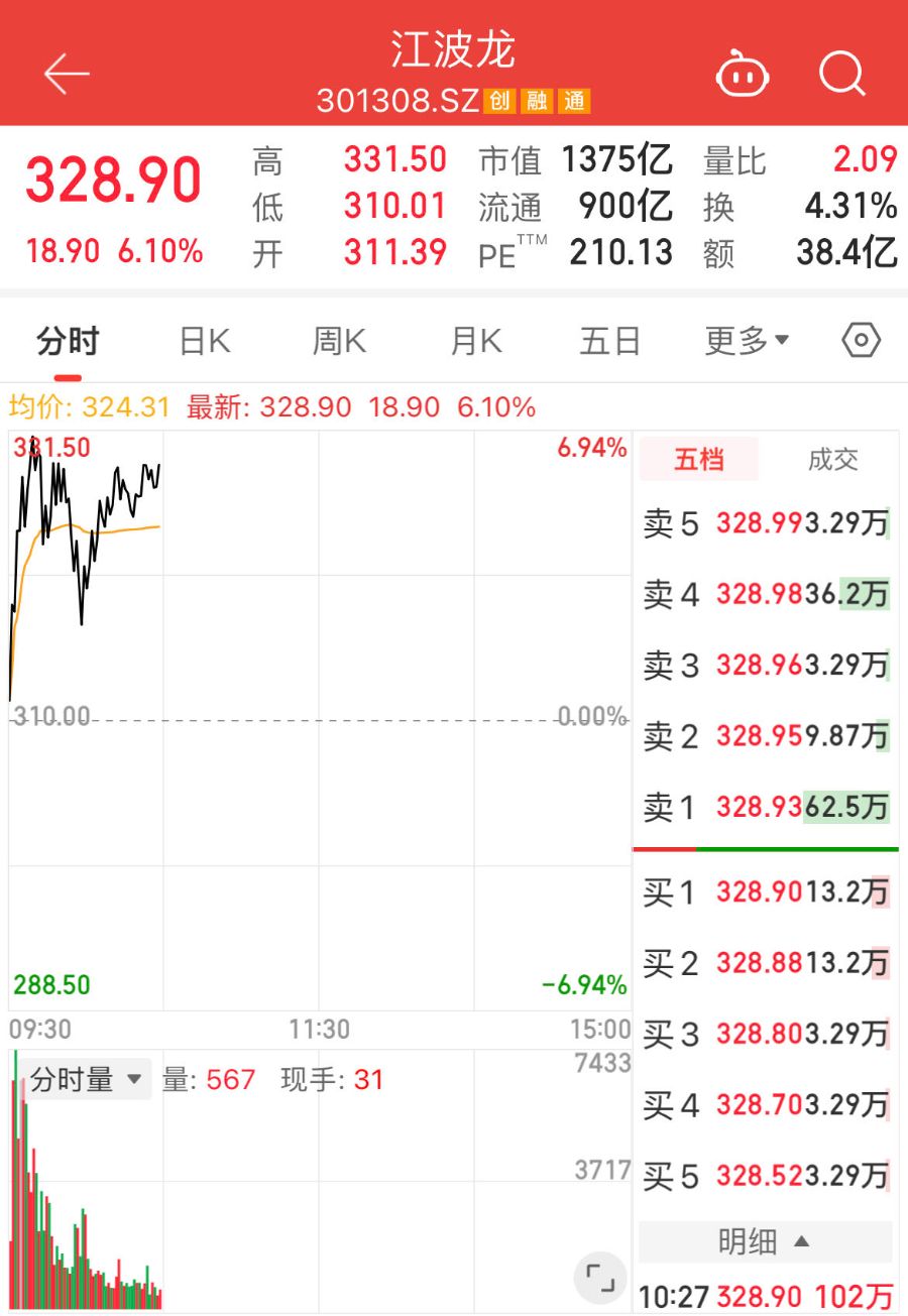 11月13日,A股存储芯片板块延续强势,江波龙(301308.SZ)盘中涨超6%,股价触及331.5元/股,再创历史新高,佰维存储(688525.SH)涨超10%,兆易创新(603986.SH)、中电港(001287.SZ)、微导纳米(688147.SH)等跟涨,板块成资本市场焦点。