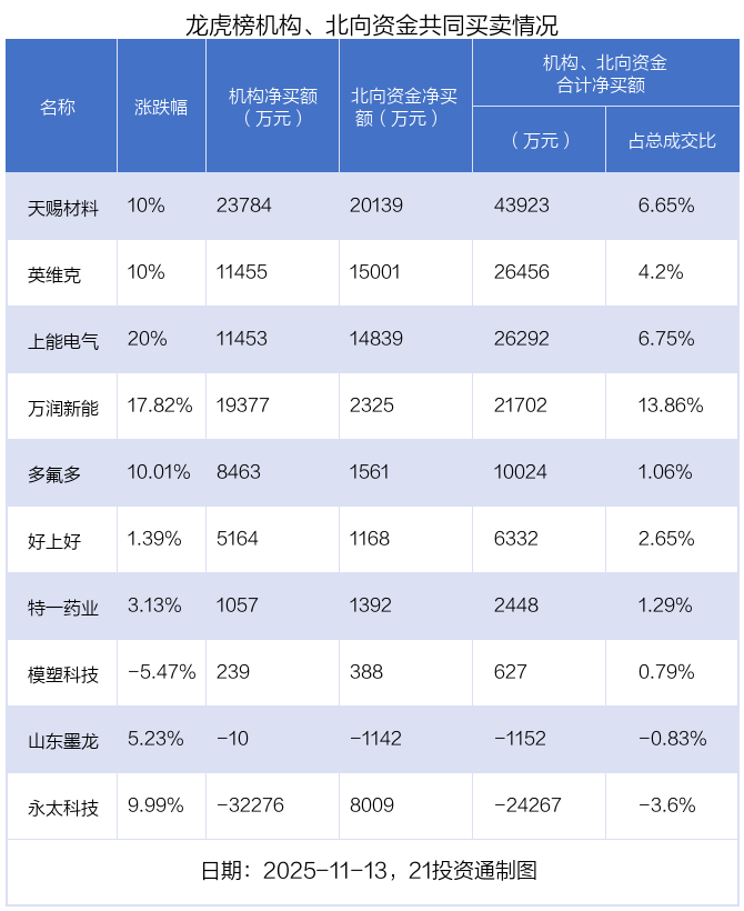 值得注意的是,机构和北向资金共同净买入了天赐材料、英维克、上能电气、万润新能、多氟多、特一药业、好上好、模塑科技等8股;共同净卖出了山东墨龙;在永太科技上出现分歧,机构净卖出永太科技3.23亿元,北向资金净买入8009.12万元。