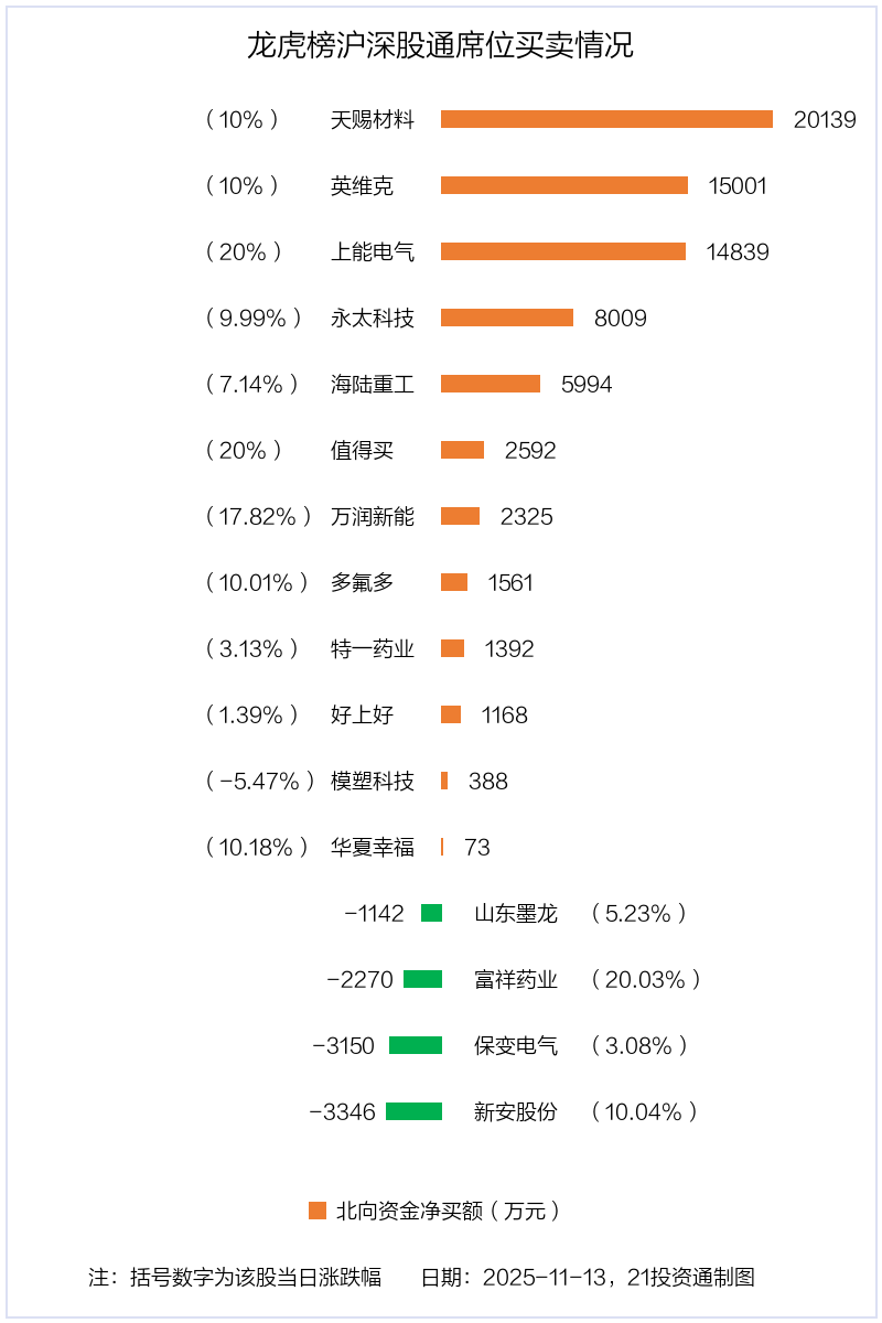 11月13日,北向资金参与龙虎榜中的个股共有16只,合计净买入6.36亿元。其中沪股通净买入2 股,净卖出2 股,合计净卖出4098.05万元;深股通净买入10 股,净卖出2 股,合计净买入6.77亿元。