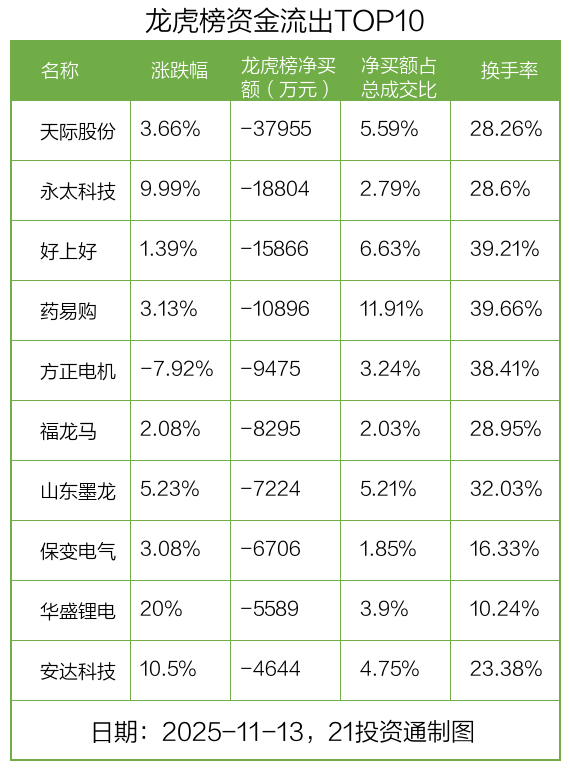而龙虎榜中资金净流出最多的是天际股份(002759.SZ),被净卖出为3.8亿元,占总成交金额的5.59%。天际股份收盘上涨3.66%,换手率为28.26%。