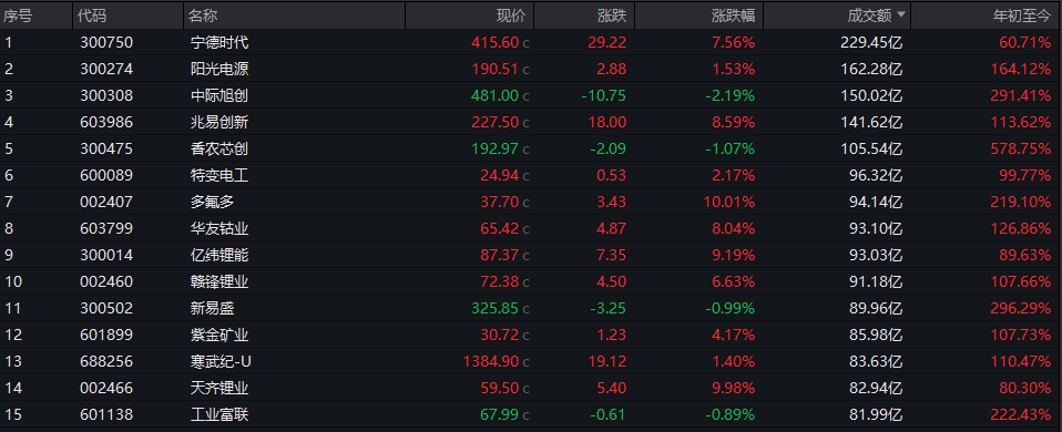 宁德时代成交额居首,为229.45元。其后是阳光电源、中际旭创、兆易创新、香农芯创,成交额分别为162.28亿元、150.02亿元、141.62亿元、105.54亿元。