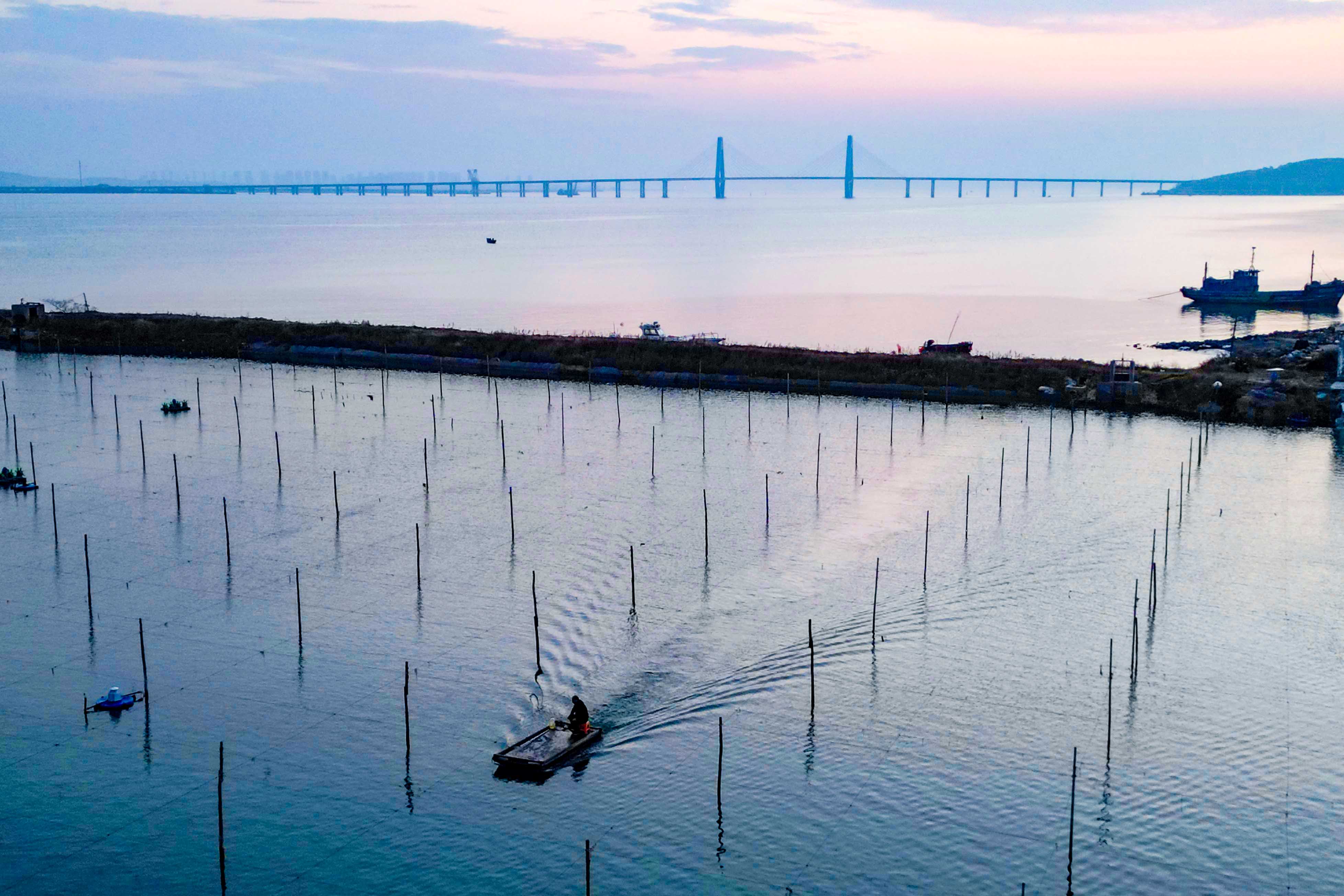 ↑ 11月10日,在山东省荣成市桑沟湾海洋牧场,养殖工人在养殖区穿梭作业(无人机照片)。新华社发(王福东 摄)