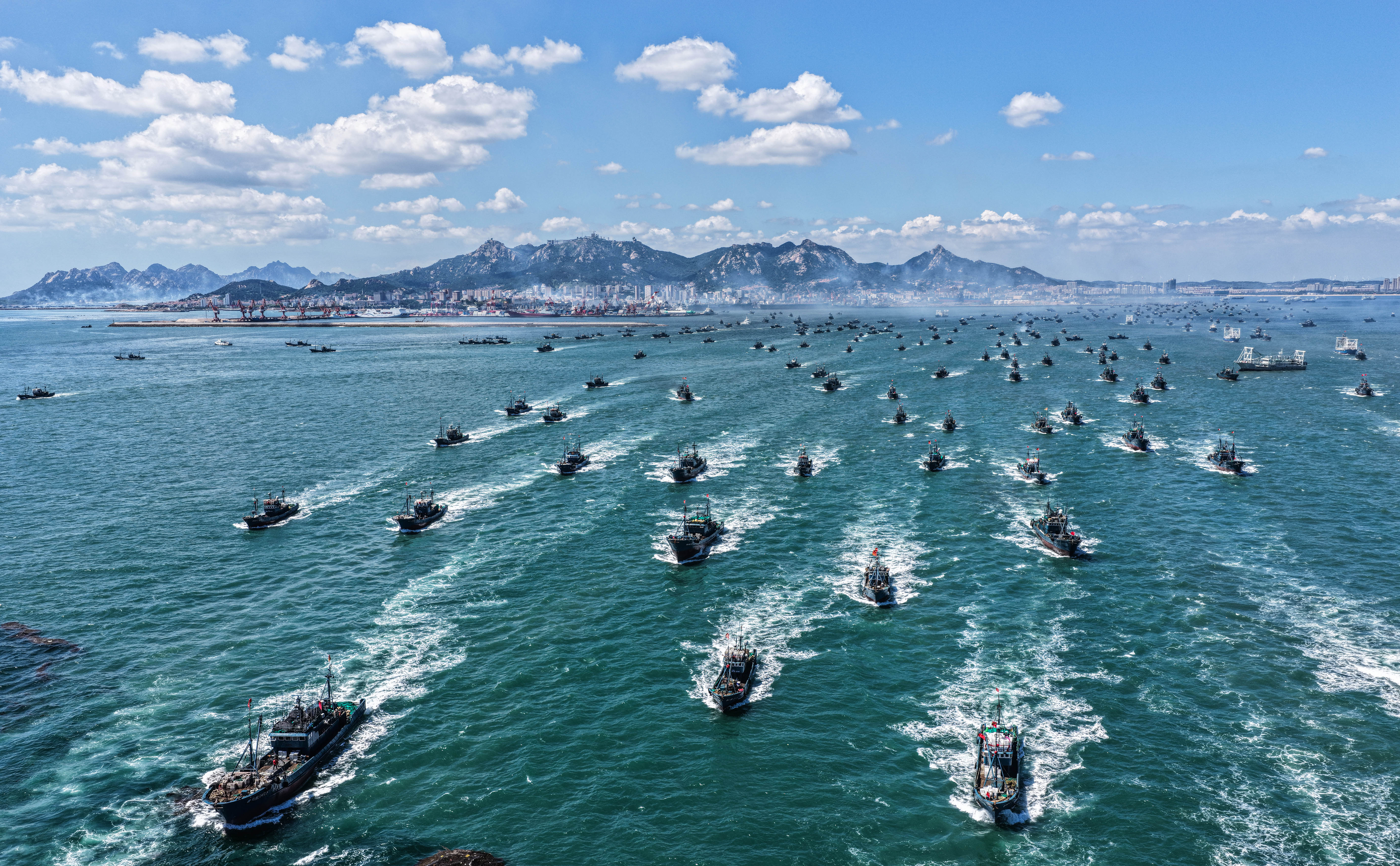 ↑ 在山东省荣成市石岛渔港,黄渤海休渔期结束后,渔民驾驶渔船出海作业(9月1日摄,无人机照片)。新华社发(李信君 摄)