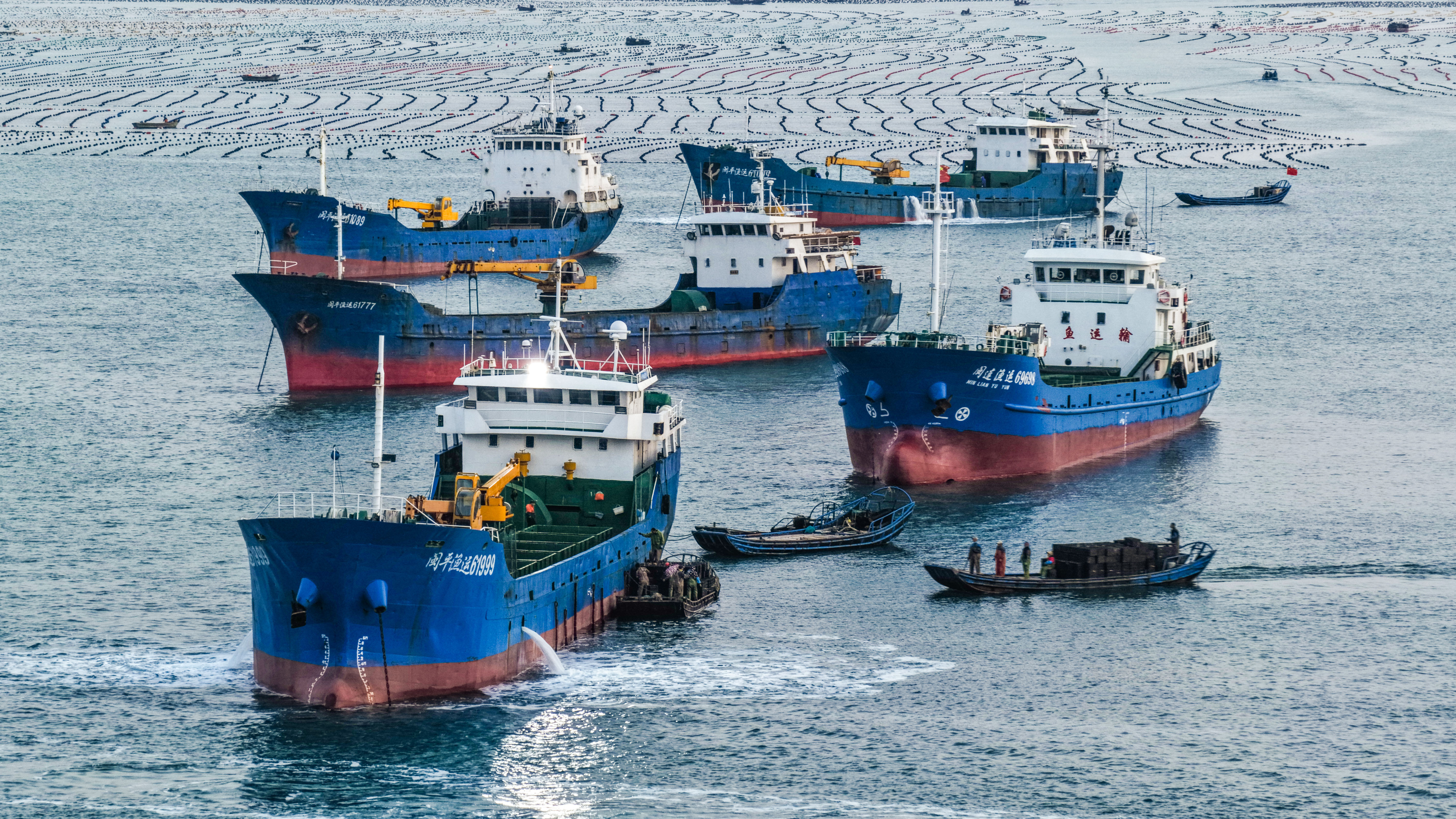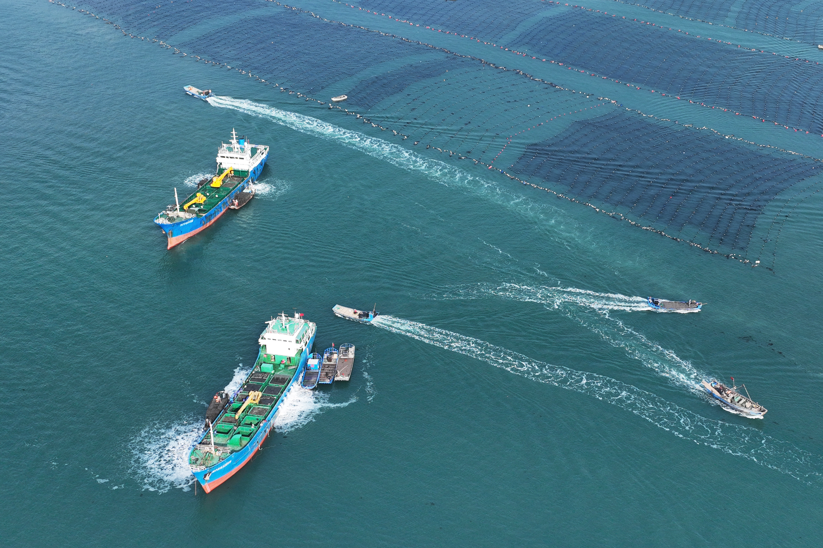 ↑ 11月11日,在山东省荣成市爱伦湾海洋牧场,运鲜船在装运鲍鱼南下福建越冬(无人机照片)。新华社发(王福东 摄)