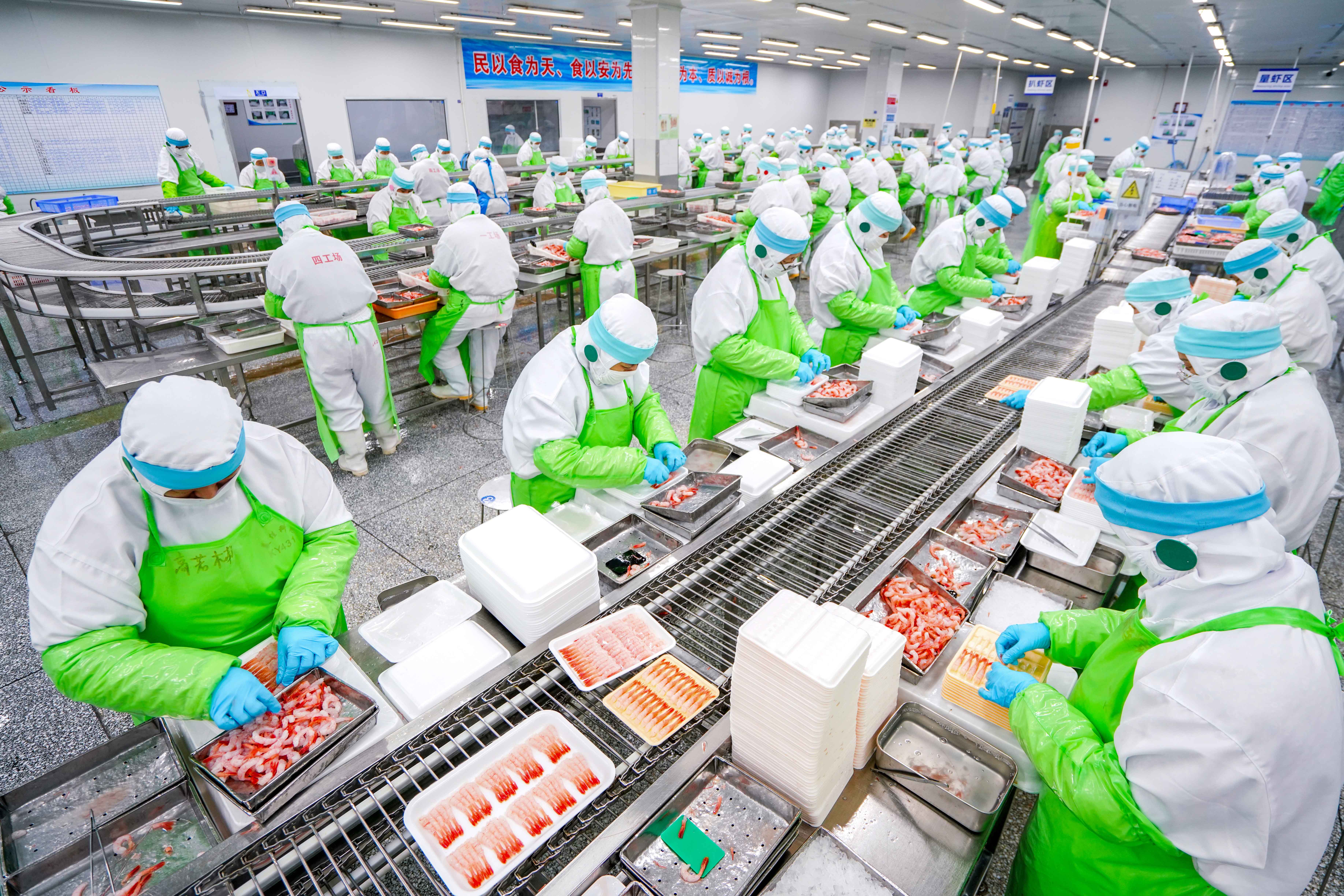 ↑ 11月10日,山东日照美佳集团的工作人员将甜虾产品装盘。新华社发(王敬之 摄)