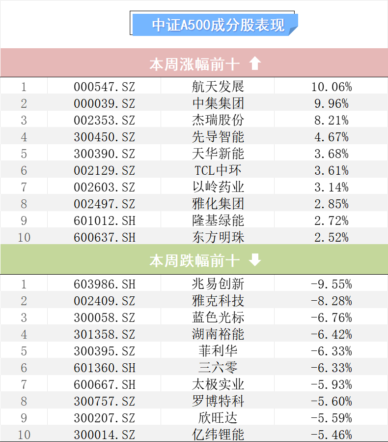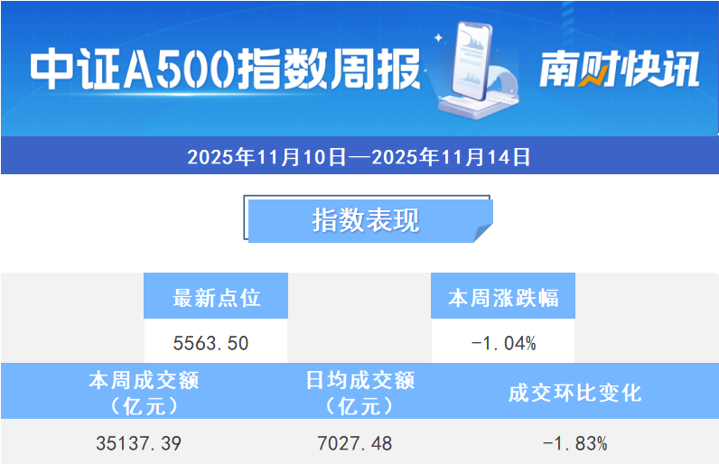 本周中证A500指数下跌1.04%,截至11月14日收盘,报5563.50点。本周日均平均成交额为7027.48亿元,单日成交额环比下降1.83%。