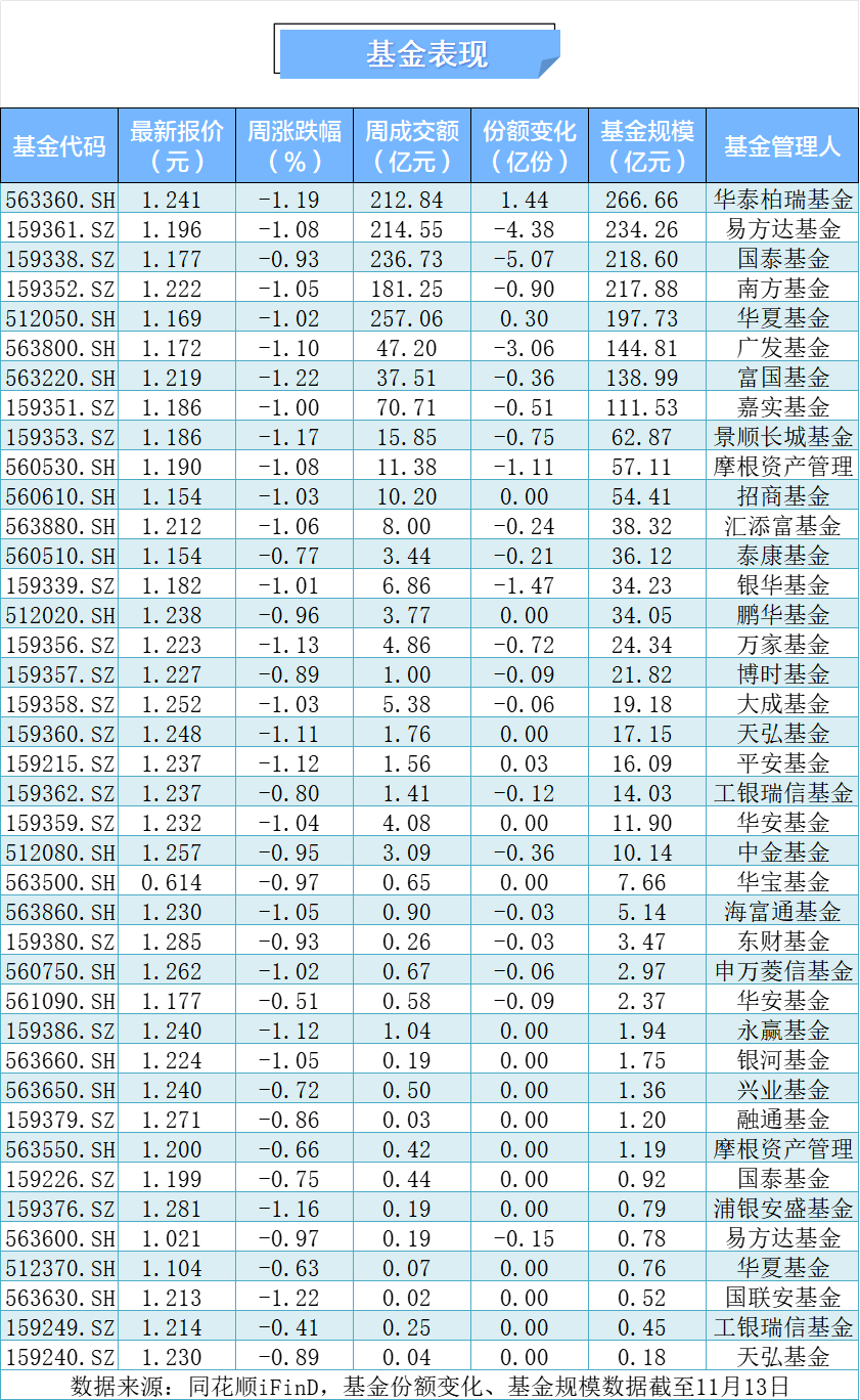 本周40只中证A500基金集体下挫,其中,国联安基金、富国基金均下跌1.12%;基金总规模继续稳在2000亿元以上,规模前三为A500ETF华泰柏瑞、A500ETF易方达、国泰基金的中证A500ETF,分别为266.66亿元、234.26亿元、218.60亿元。