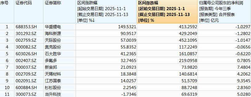 据统计,11月初至11月13日,纳入Wind电解液板块的11只个股平均涨幅为43.76%,其中华盛锂电、海科新源上涨149.53%和90.95%。