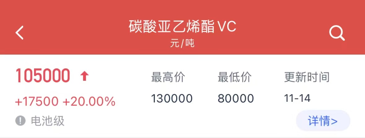 SMM数据显示,11月13日、14日,碳酸亚乙烯酯分别调涨1.35万元/吨、1.75万元/吨,单日涨幅达到18.24%、20%。截至11月14日,该产品市场均价已经涨至10.5万元/吨,较10月末的价格几近翻倍。