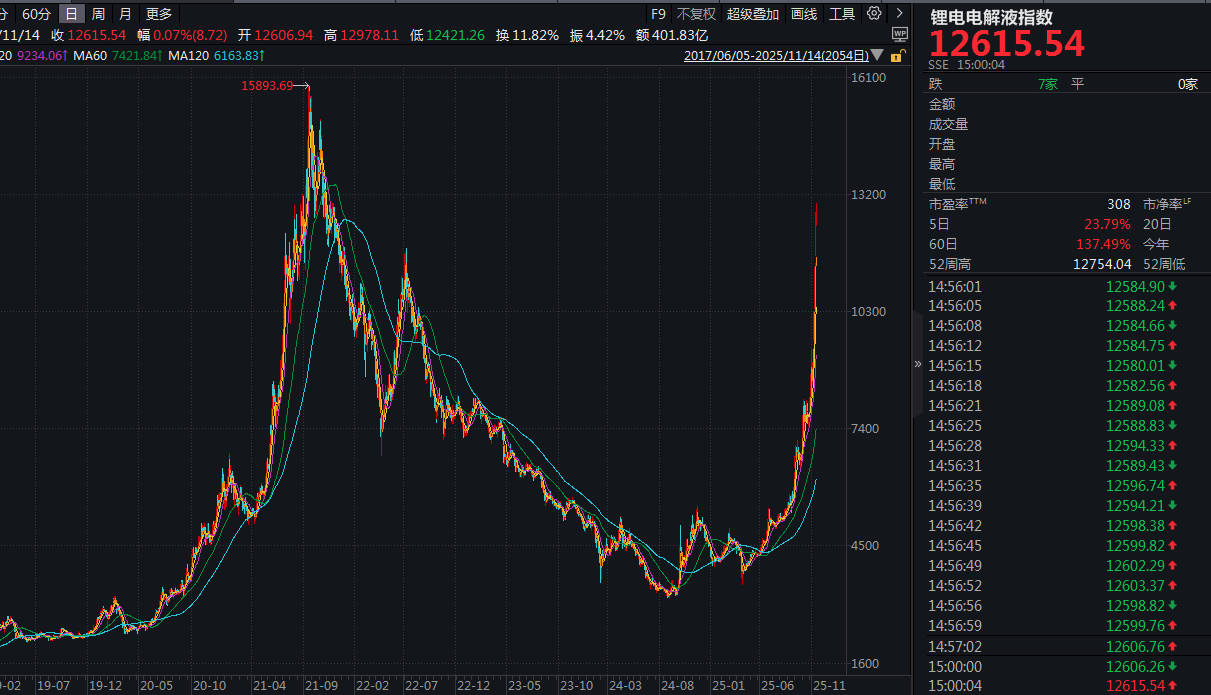 截至11月13日收盘,碳酸锂期货加权合约已经创出年内新高,当月累计涨幅达到8.28%;到11月14日,国内电池级碳酸锂市场均价升至8.52万元/吨,同样逼近今年8月的年内高点。