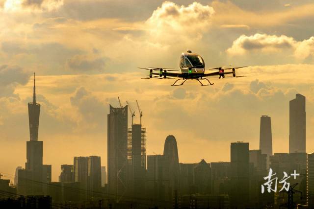 “飞行汽车第一股”亿航智能的无人驾驶载人航空器在广州进行飞行演示。