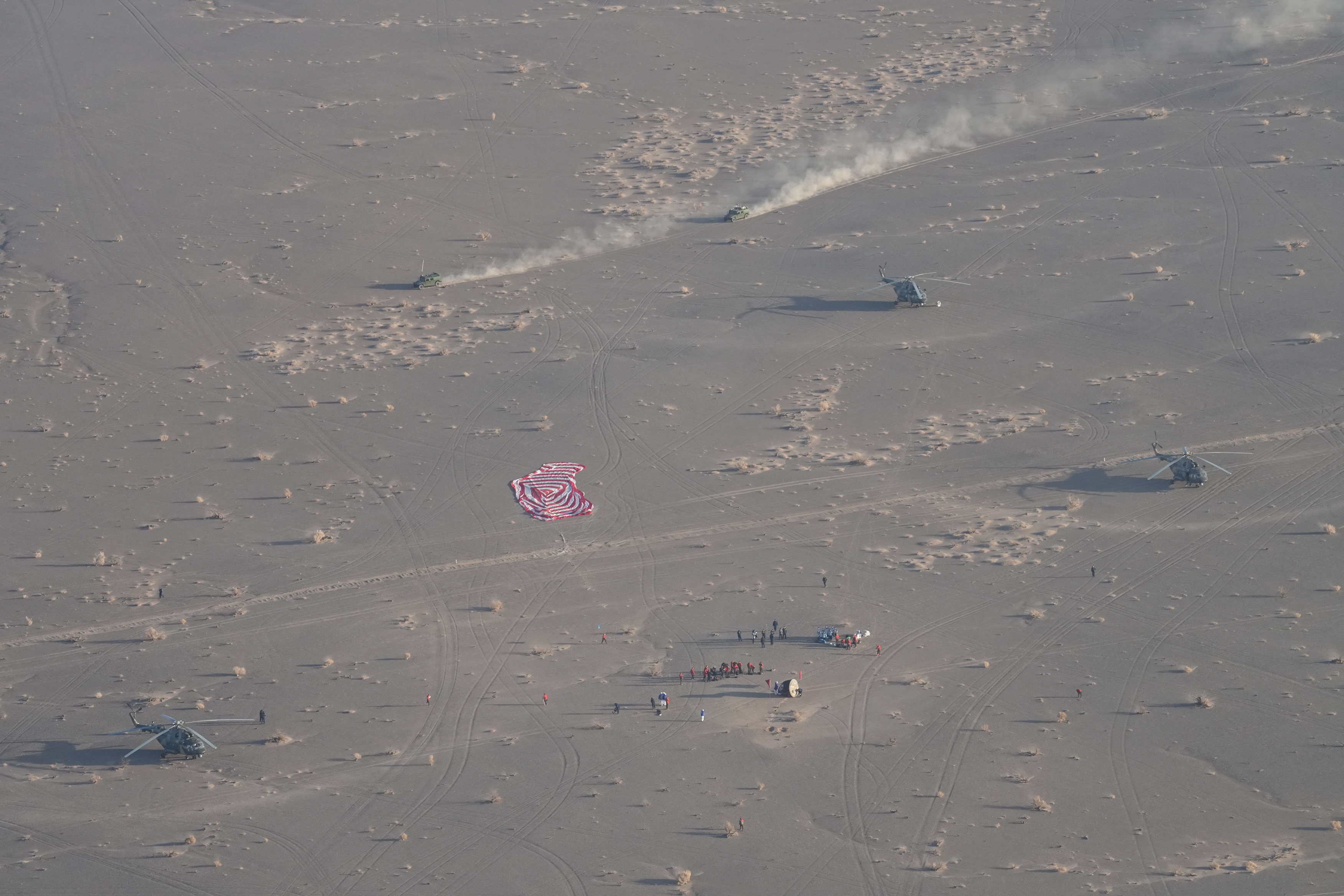 14日下午,返回舱主伞打开瞬间,酒泉卫星发射中心李斌斌已锁定跟踪,实时画面传向指控大厅。空中分队、地面分队等向落点集结,共同搭建起“空地一体、立体协同”多维搜救体系。