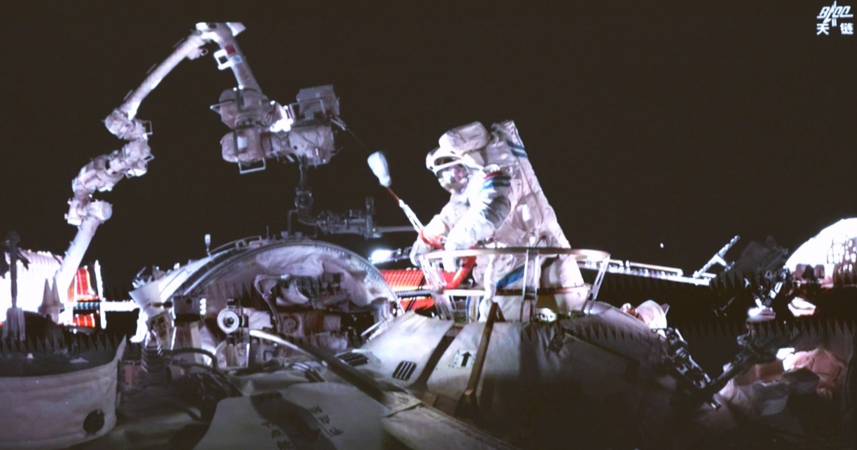 ↑这是9月25日晚在北京航天飞行控制中心屏幕上拍摄的神舟二十号乘组航天员王杰在空间站组合体舱外作业的画面。新华社记者李明刚 摄