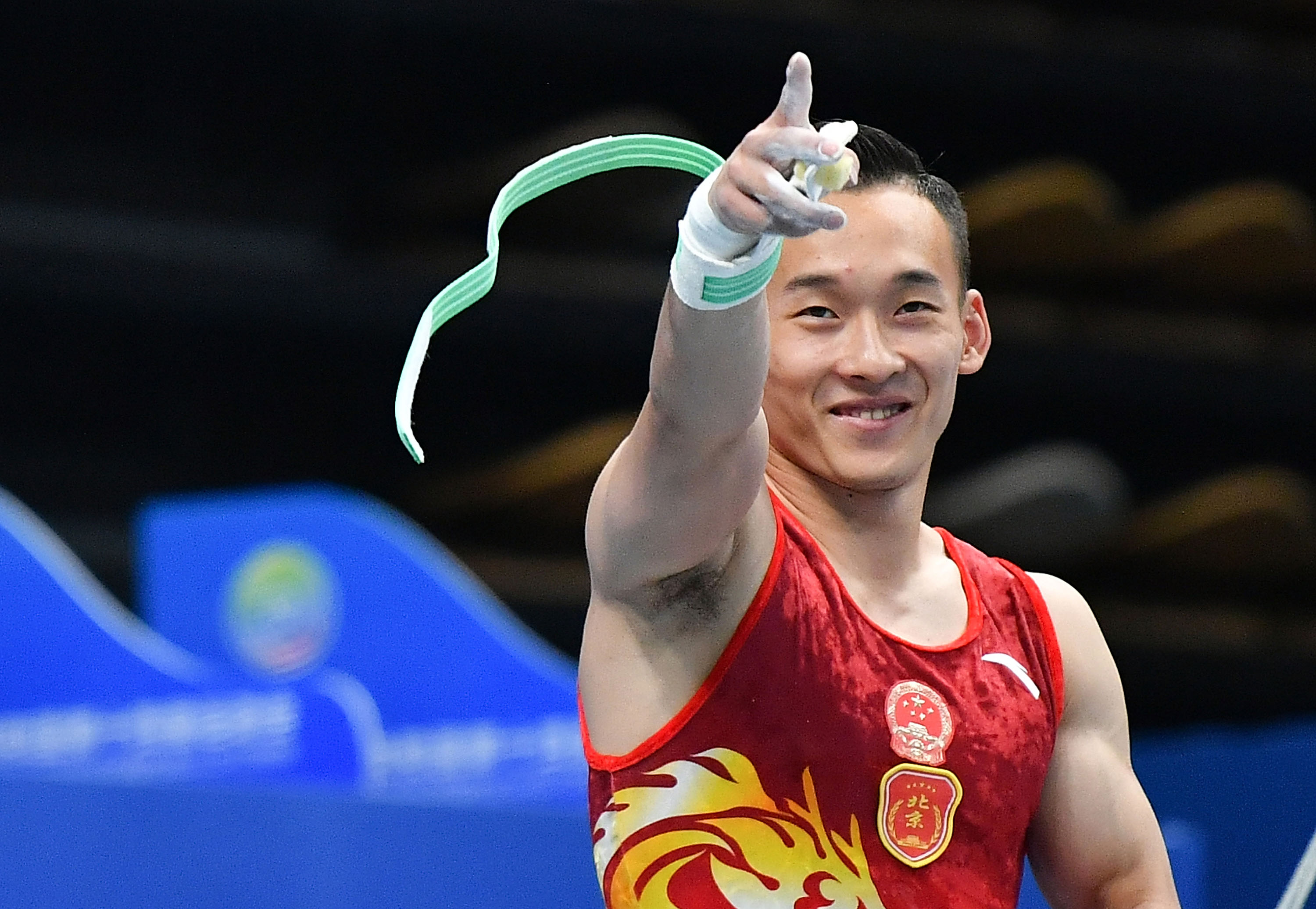 2021年9月23日,北京队选手肖若腾在第十四届全国运动会体操男子个人全能决赛间隙向观众致意。新华社记者 张博文 摄