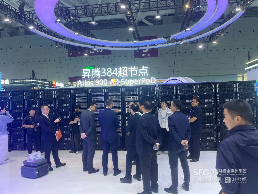 除了机器人的场景落地亮相,当AI算力正成为全球计算生态的重要力量,此前在上海世界人工智能大会上被誉为“镇馆之宝”的昇腾384超节点在高交会现场首次展出。