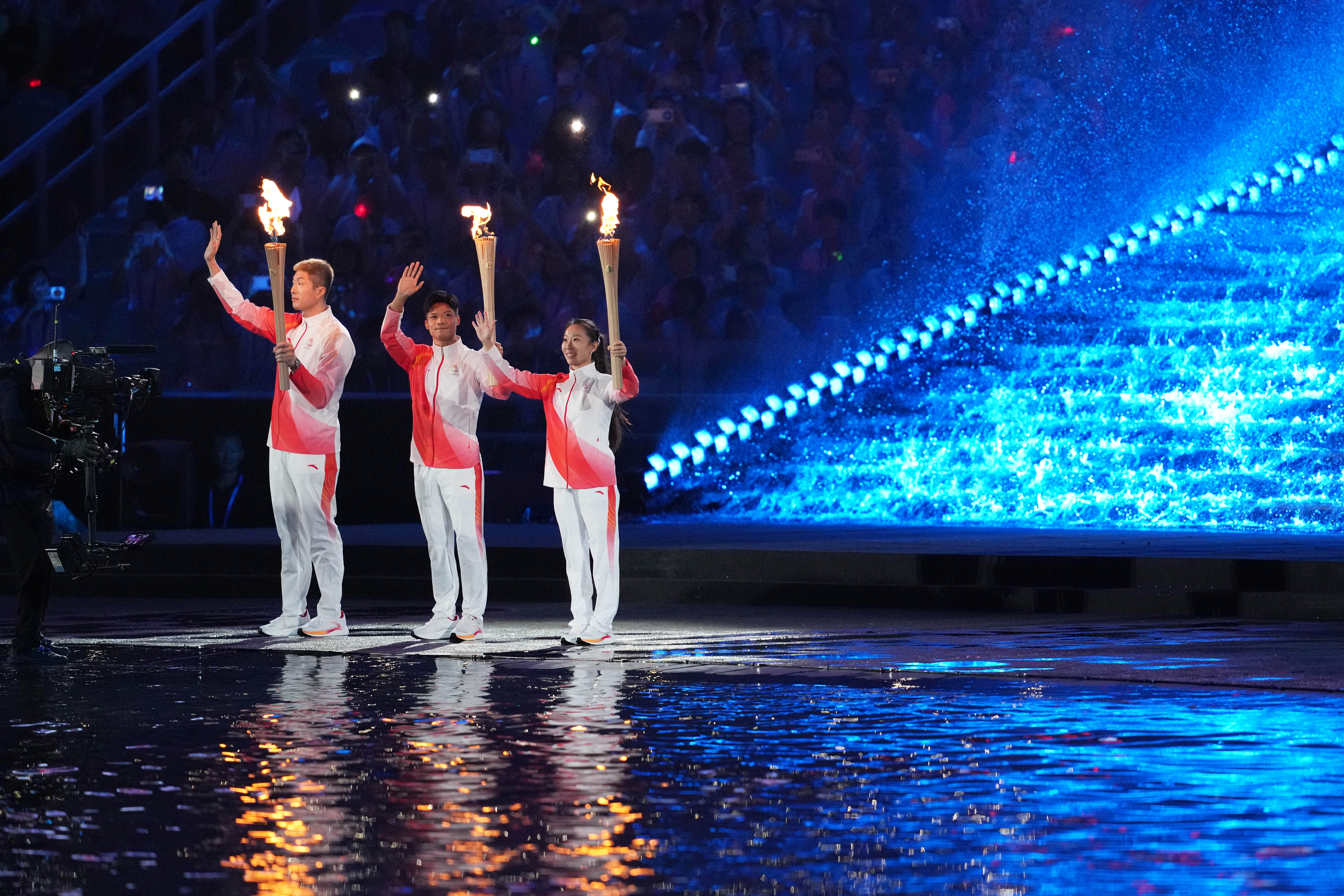 11月9日,火炬手苏炳添(中)、张家朗(左)、李祎点燃主火炬后向观众致意。新华社记者 肖艺九 摄