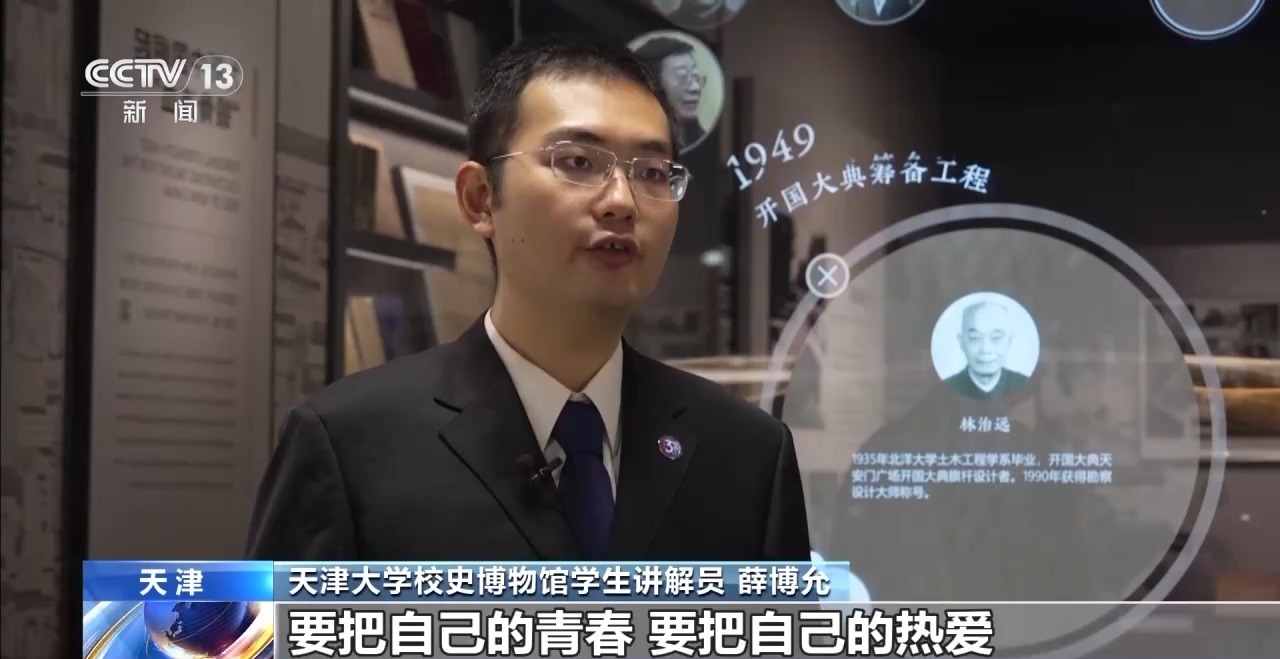 天津大学校史博物馆学生讲解员 薛博允:22.5米的旗杆要求国旗全自动升降,这在旧工业体系下没有先例,林治远校友是无数天大人的缩影,这也给像我这样的新天大人启示,要把自己的青春,要把自己的热爱奉献在祖国需要的地方。