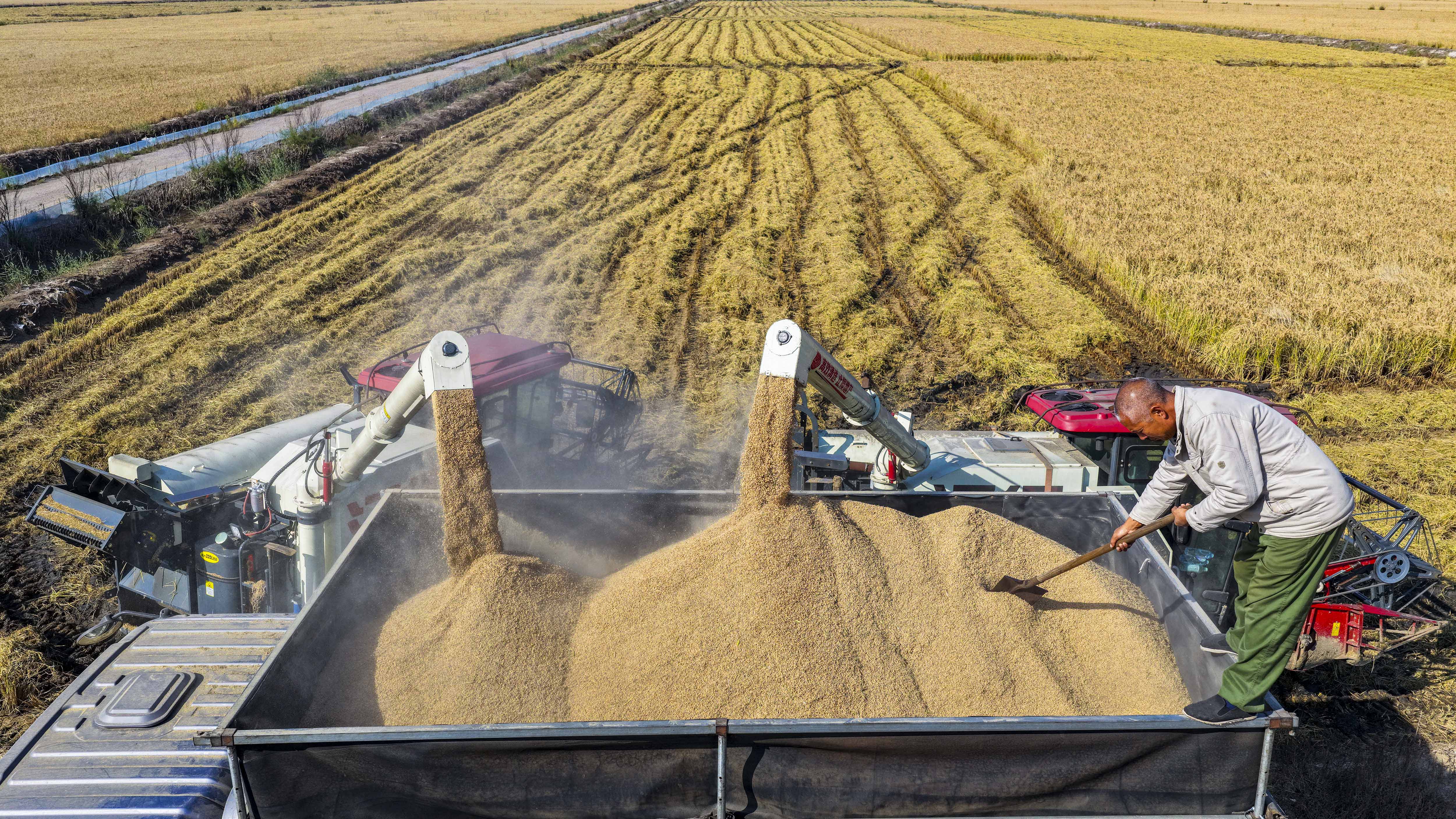 10月27日,河北省唐山市海港经济开发区王滩镇农民将收获的稻谷装车,准备运出稻田晾晒(无人机照片)。新华社发(刘满仓 摄)