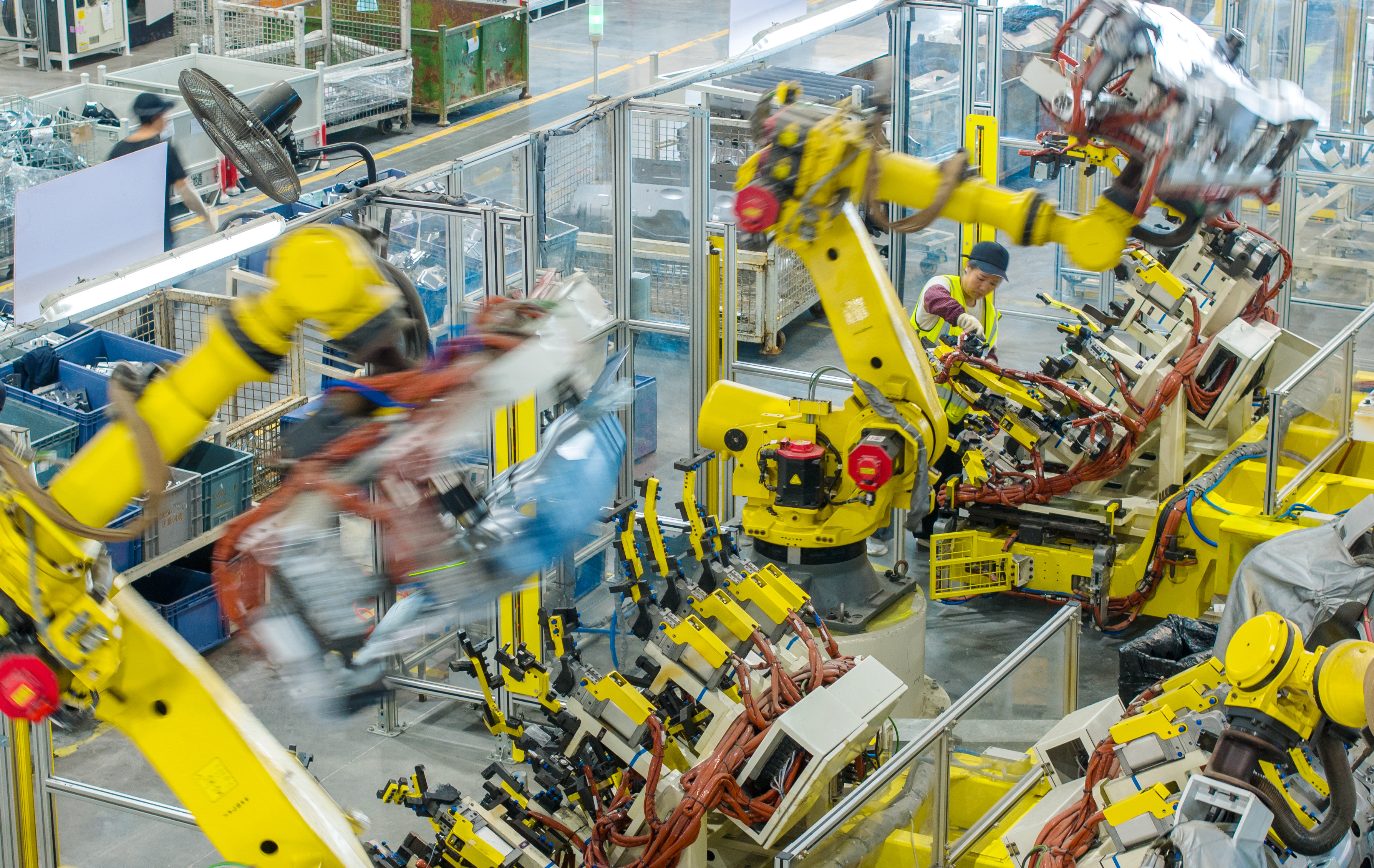 2025年10月9日,浙江省湖州市长兴经济技术开发区的长兴地通汽车部件有限公司技术人员操控工业机器人生产新能源汽车配件(无人机照片)。新华社发(谭云俸摄)
