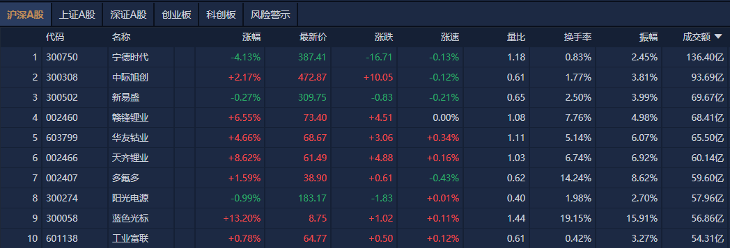 个股方面,宁德时代成交额超136亿元居首,中际旭创、新易盛、赣锋锂业成交额靠前。
