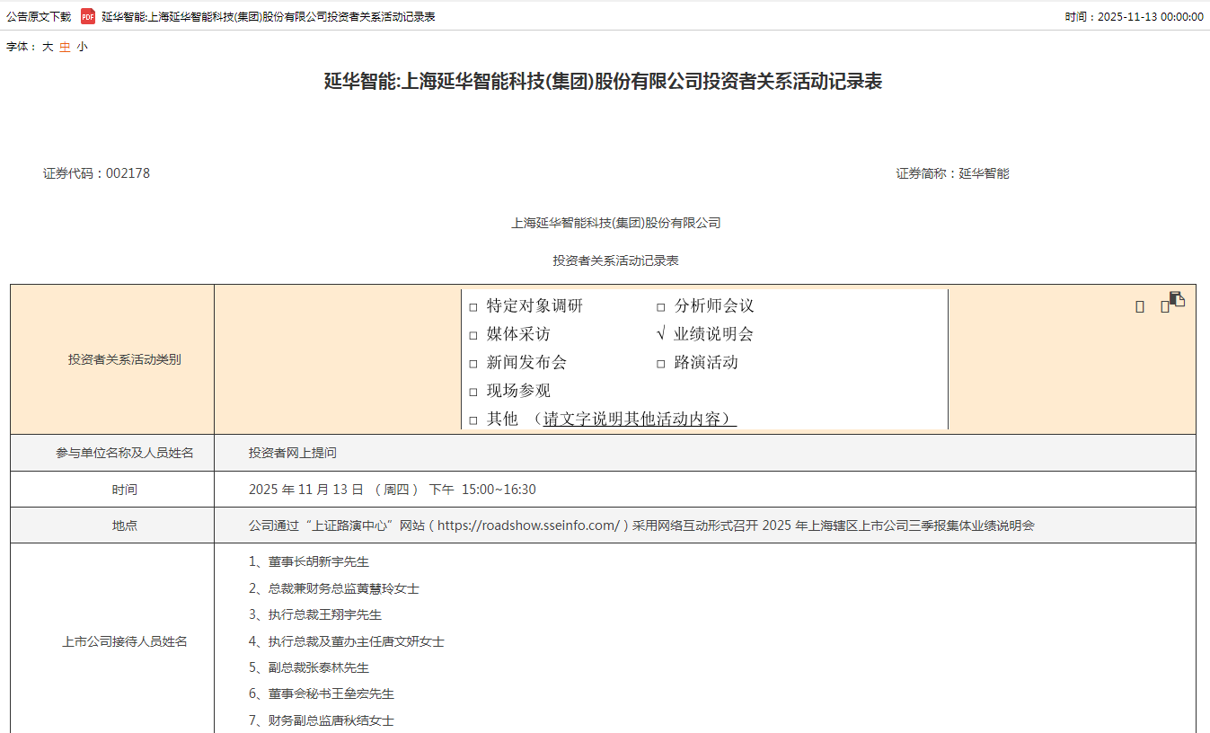 公告显示,为便于广大投资者更全面深入地了解公司治理、经营成果、财务状况,公司于2025年11月13日以网络互动形式,参加2025年上海辖区上市公司三季报集体业绩说明会,就投资者关心的问题进行集中交流与解答。